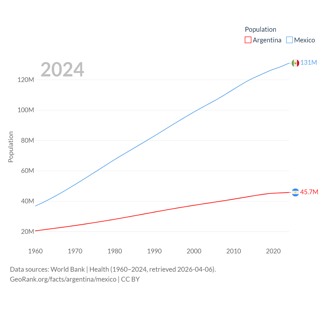 Argentina has a population of 45.7M (ranked 35/197), compared with 131M in Mexico (ranked 11/197). Argentina's land area is 1,056,642 sq mi versus 750,563 sq mi for Mexico (ranked 8th vs. 13th).
