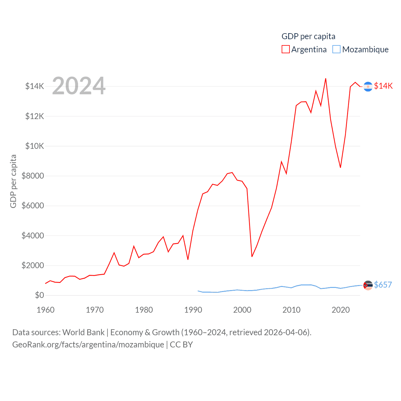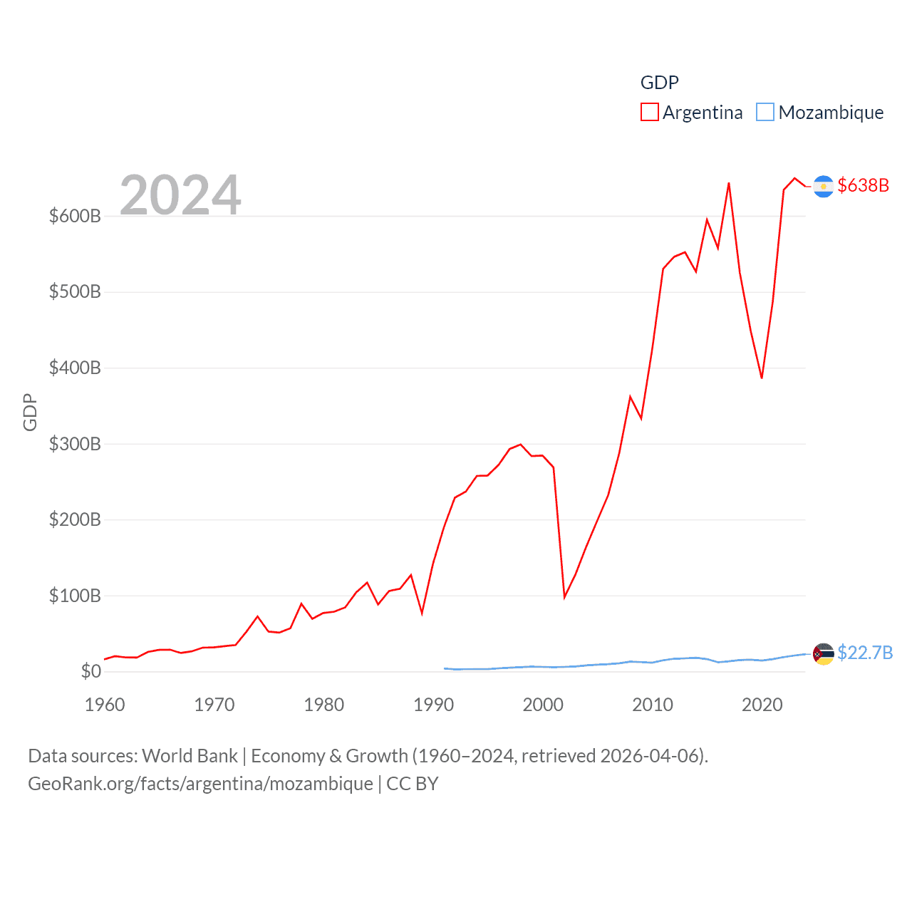 By GDP, Argentina ranks 24/197 ($638B) and Mozambique ranks 123/197 ($22.7B). By GDP per capita, Argentina ranks 72/197 ($13,970), while Mozambique ranks 189/197 ($657).