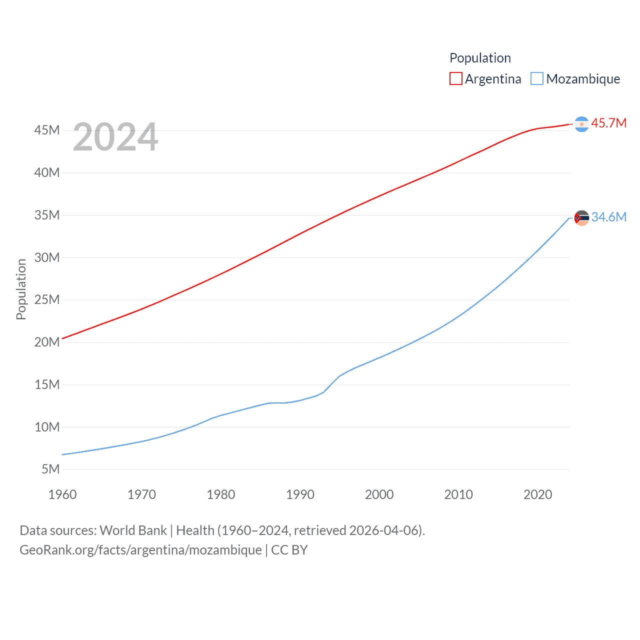Argentina has a population of 45.7M (ranked 35/197), compared with 34.6M in Mozambique (ranked 46/197). Argentina's land area is 1,056,642 sq mi versus 303,623 sq mi for Mozambique (ranked 8th vs. 34th).