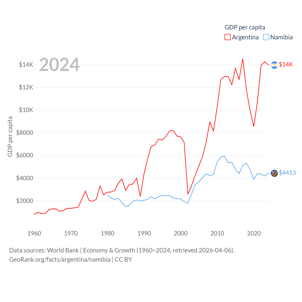 By GDP, Argentina ranks 24/197 ($638B) and Namibia ranks 147/197 ($13.4B). By GDP per capita, Argentina ranks 72/197 ($13,970), while Namibia ranks 126/197 ($4,413).