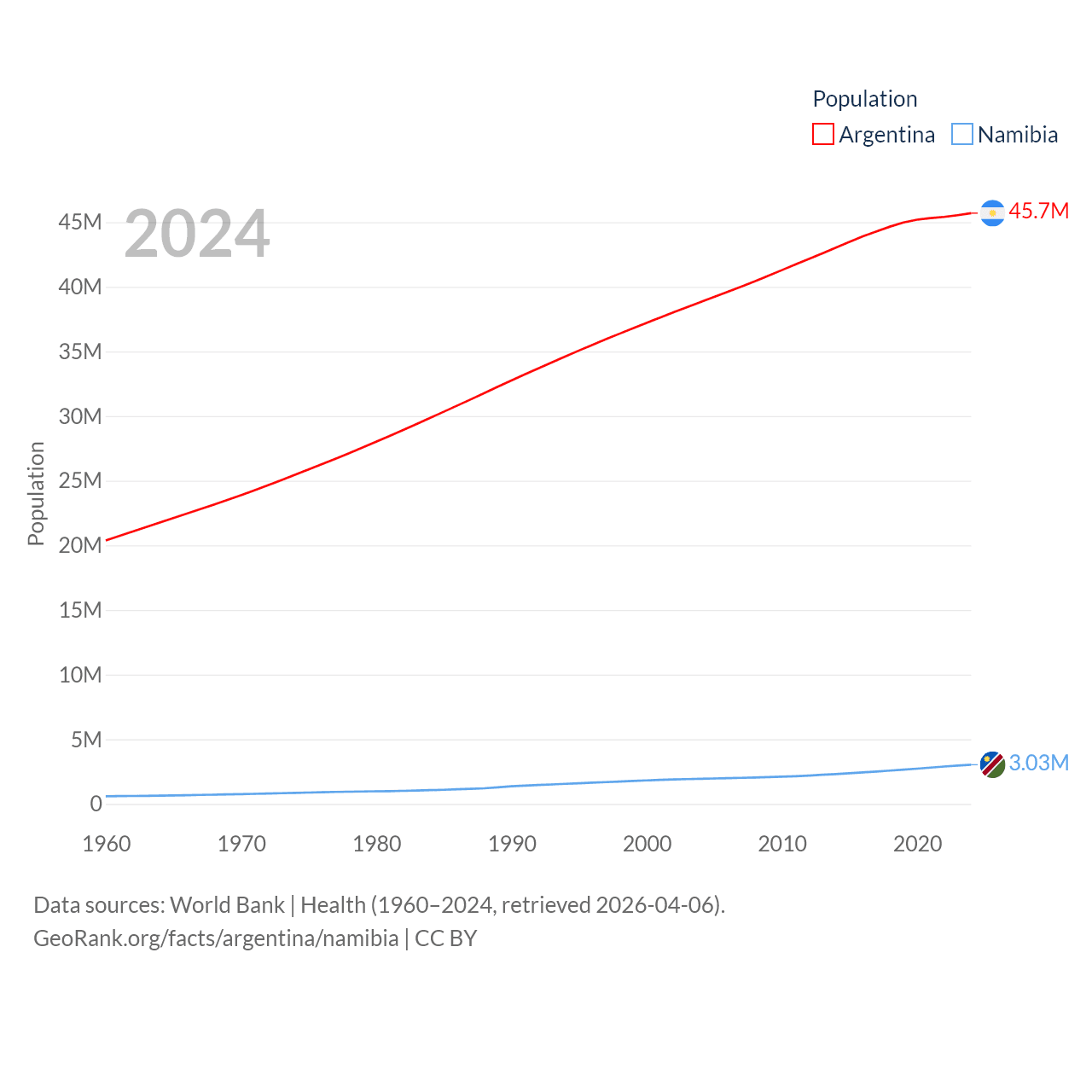 Argentina has a population of 45.7M (ranked 35/197), compared with 3.03M in Namibia (ranked 136/197). Argentina's land area is 1,056,642 sq mi versus 317,874 sq mi for Namibia (ranked 8th vs. 33rd).