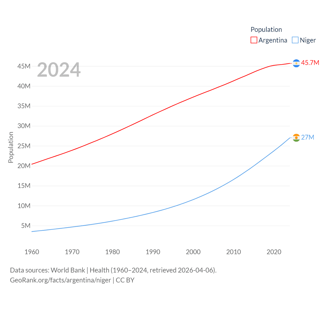 Argentina has a population of 45.7M (ranked 35/197), compared with 27M in Niger (ranked 55/197). Argentina's land area is 1,056,642 sq mi versus 489,076 sq mi for Niger (ranked 8th vs. 20th).