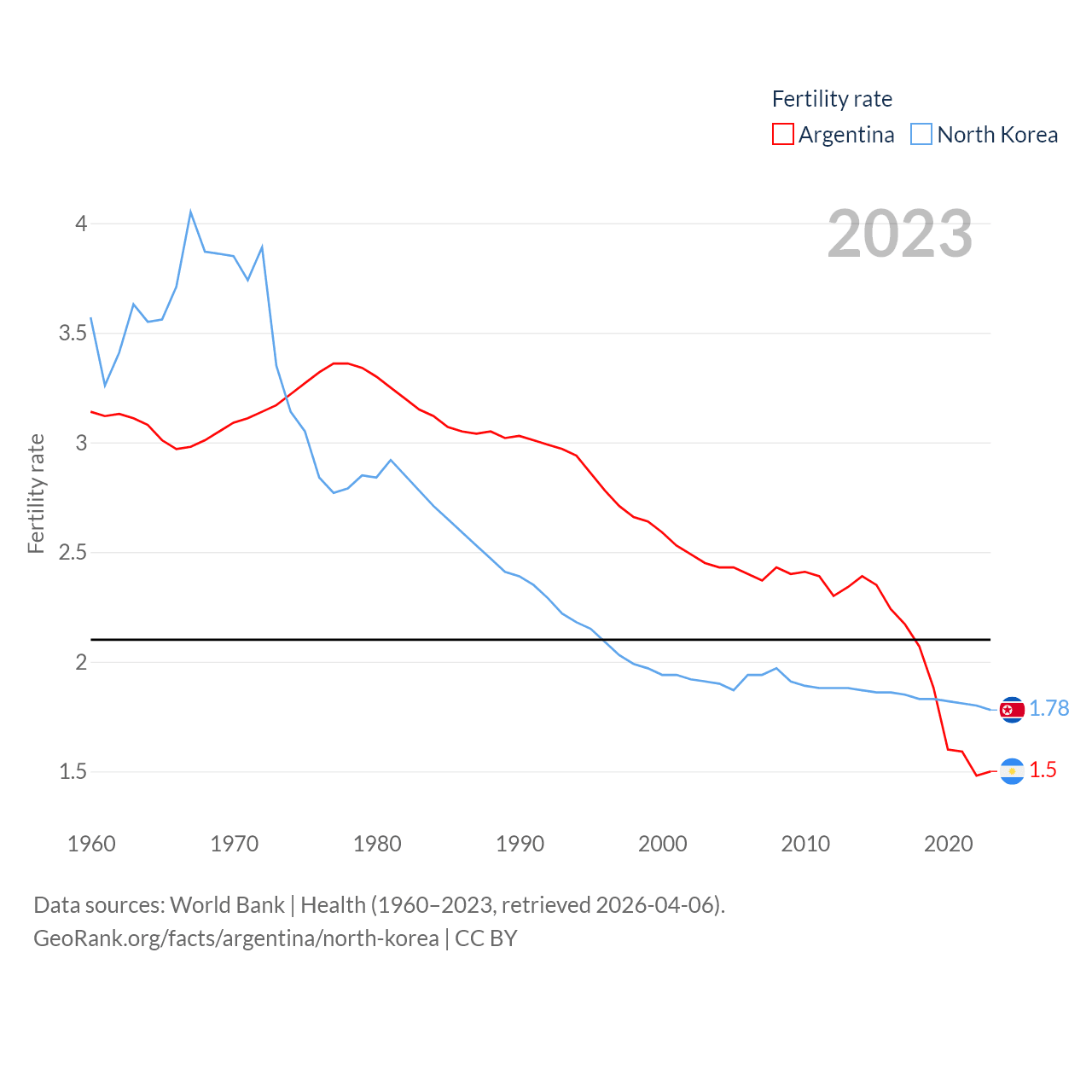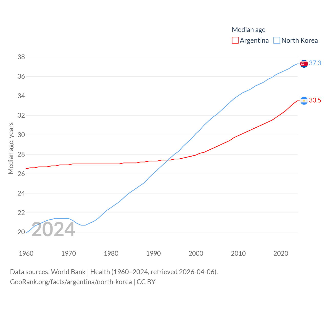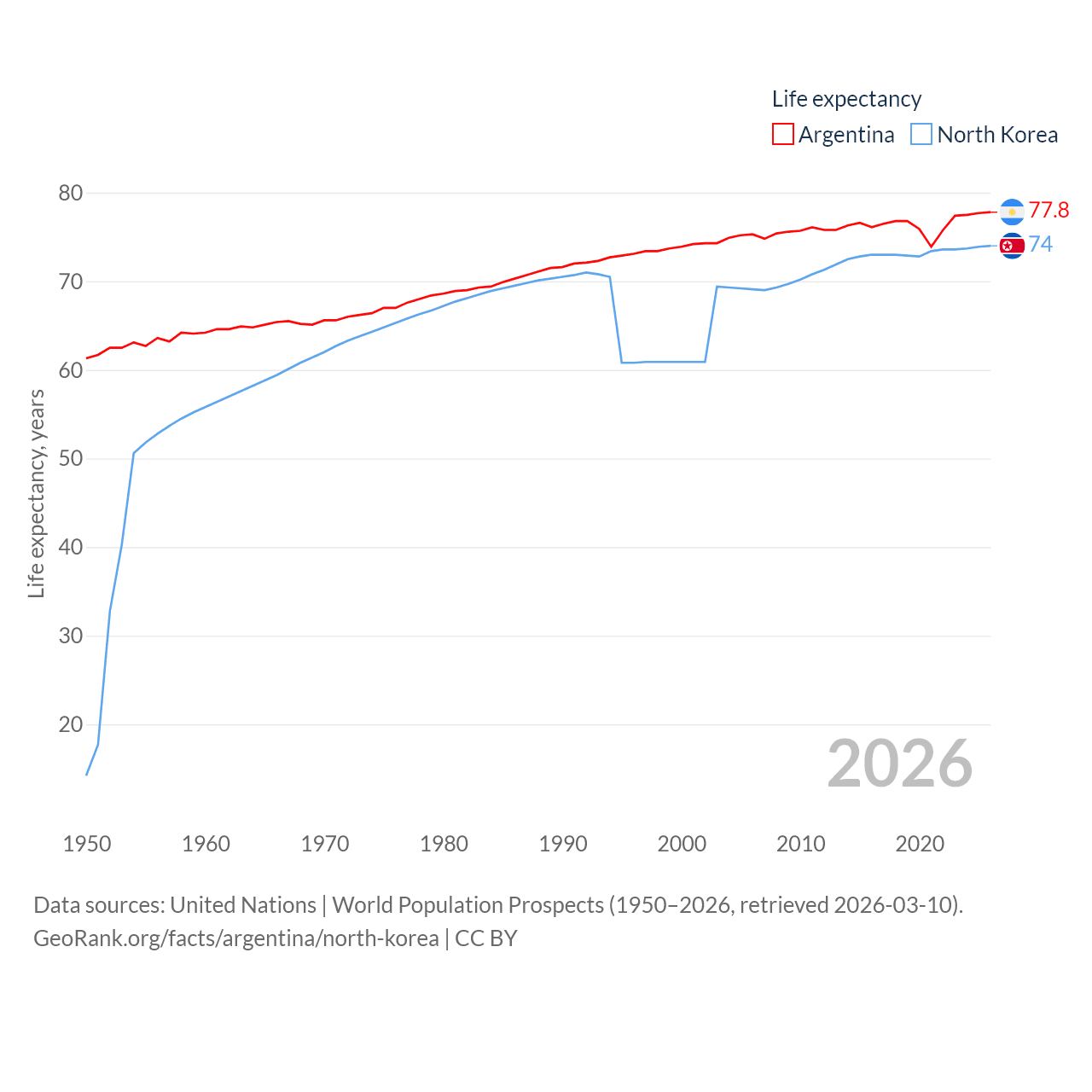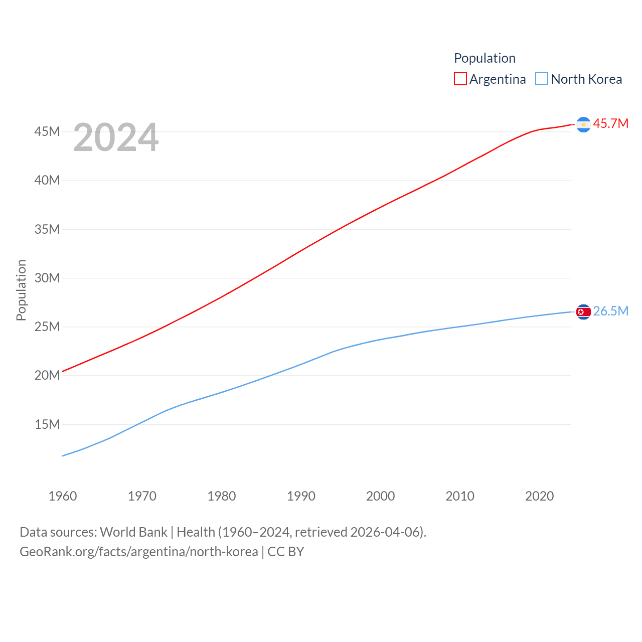 Argentina has a population of 45.7M (ranked 35/197), compared with 26.5M in North Korea (ranked 56/197). Argentina's land area is 1,056,642 sq mi versus 46,491 sq mi for North Korea (ranked 8th vs. 97th).