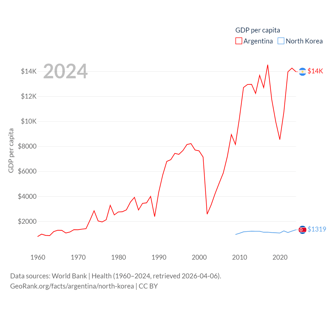 By GDP, Argentina ranks 24/197 ($638B) and North Korea ranks 106/197 ($34.9B). By GDP per capita, Argentina ranks 72/197 ($13,970), while North Korea ranks 168/197 ($1,319).