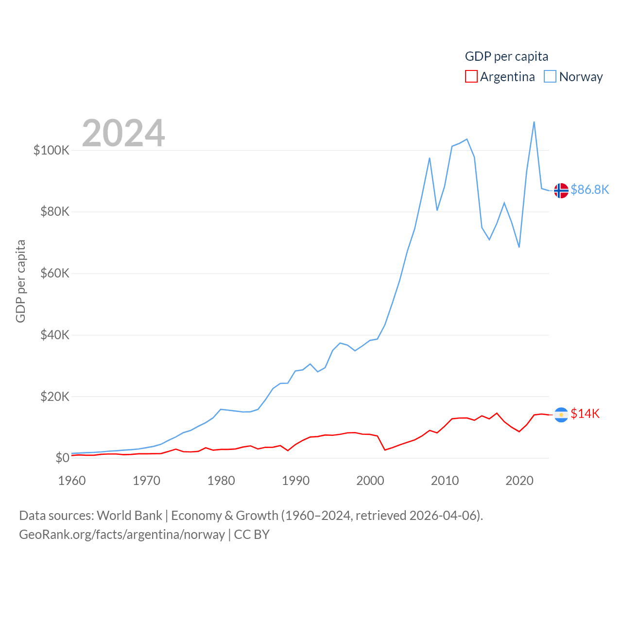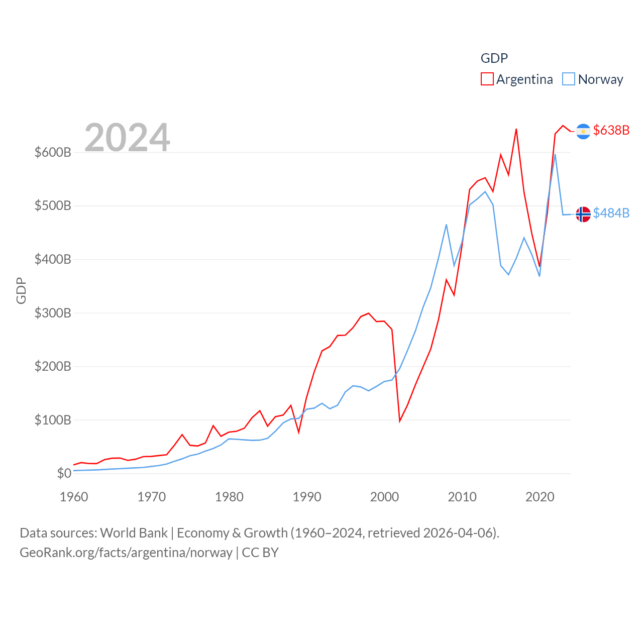 By GDP, Argentina ranks 24/197 ($638B) and Norway ranks 32/197 ($484B). By GDP per capita, Argentina ranks 72/197 ($13,970), while Norway ranks 8/197 ($86,785).