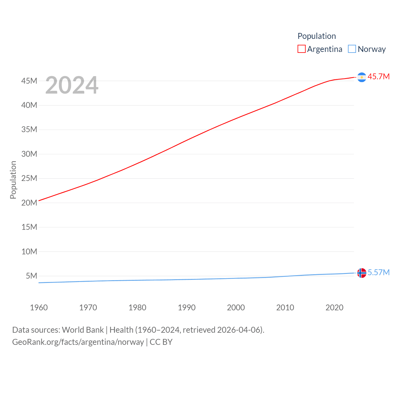 Argentina has a population of 45.7M (ranked 35/197), compared with 5.57M in Norway (ranked 118/197). Argentina's land area is 1,056,642 sq mi versus 140,645 sq mi for Norway (ranked 8th vs. 62nd).