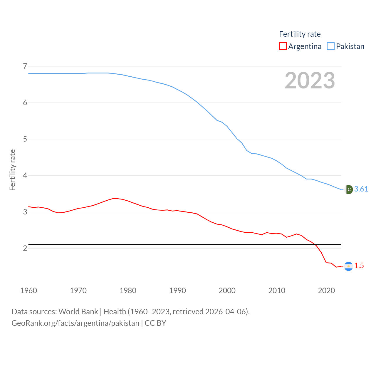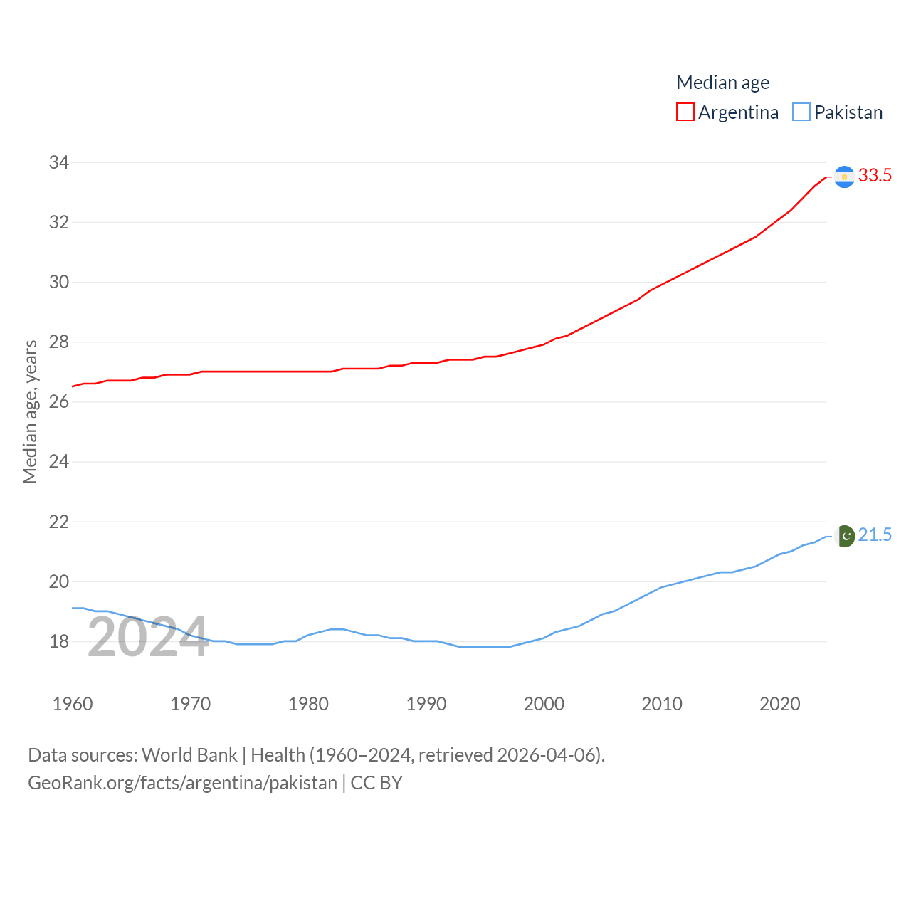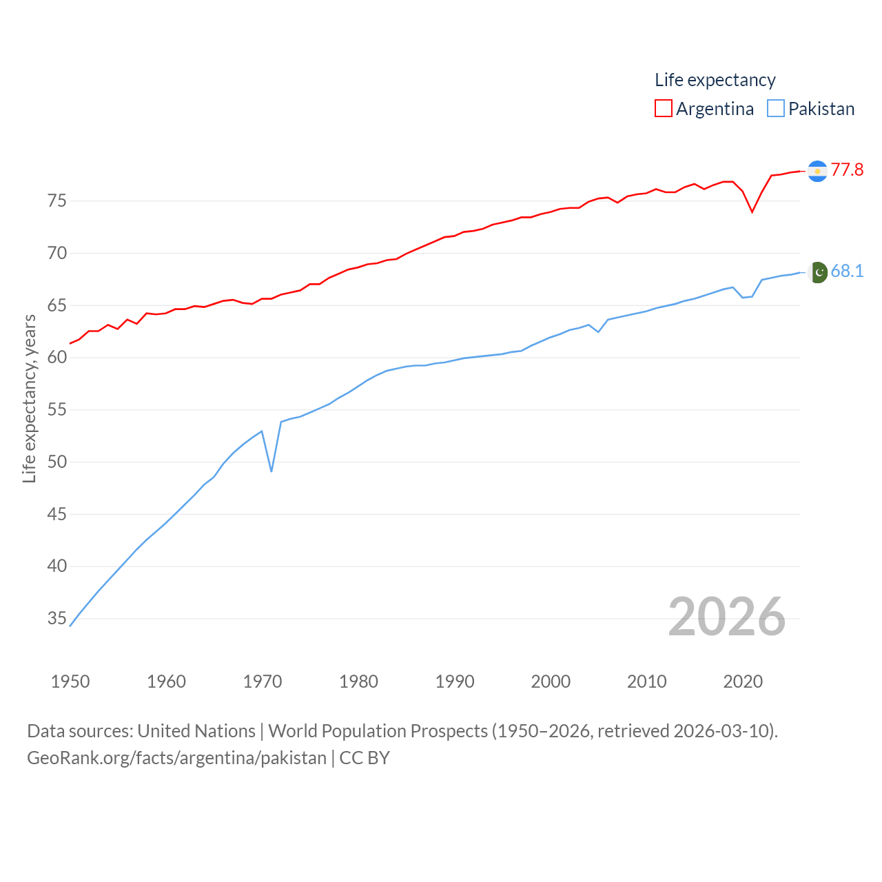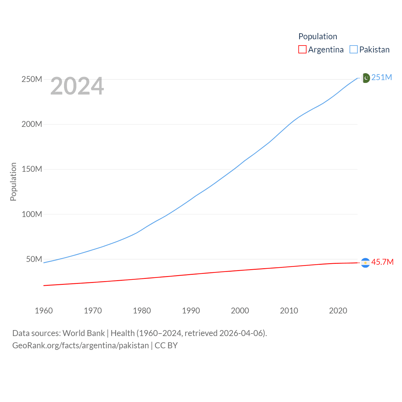 Argentina has a population of 45.7M (ranked 35/197), compared with 251M in Pakistan (ranked 5/197). Argentina's land area is 1,056,642 sq mi versus 297,638 sq mi for Pakistan (ranked 8th vs. 35th).