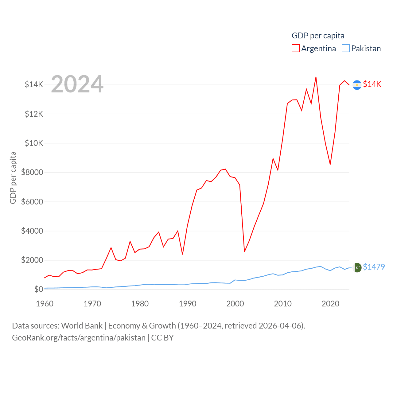 By GDP, Argentina ranks 24/197 ($638B) and Pakistan ranks 43/197 ($372B). By GDP per capita, Argentina ranks 72/197 ($13,970), while Pakistan ranks 163/197 ($1,479).