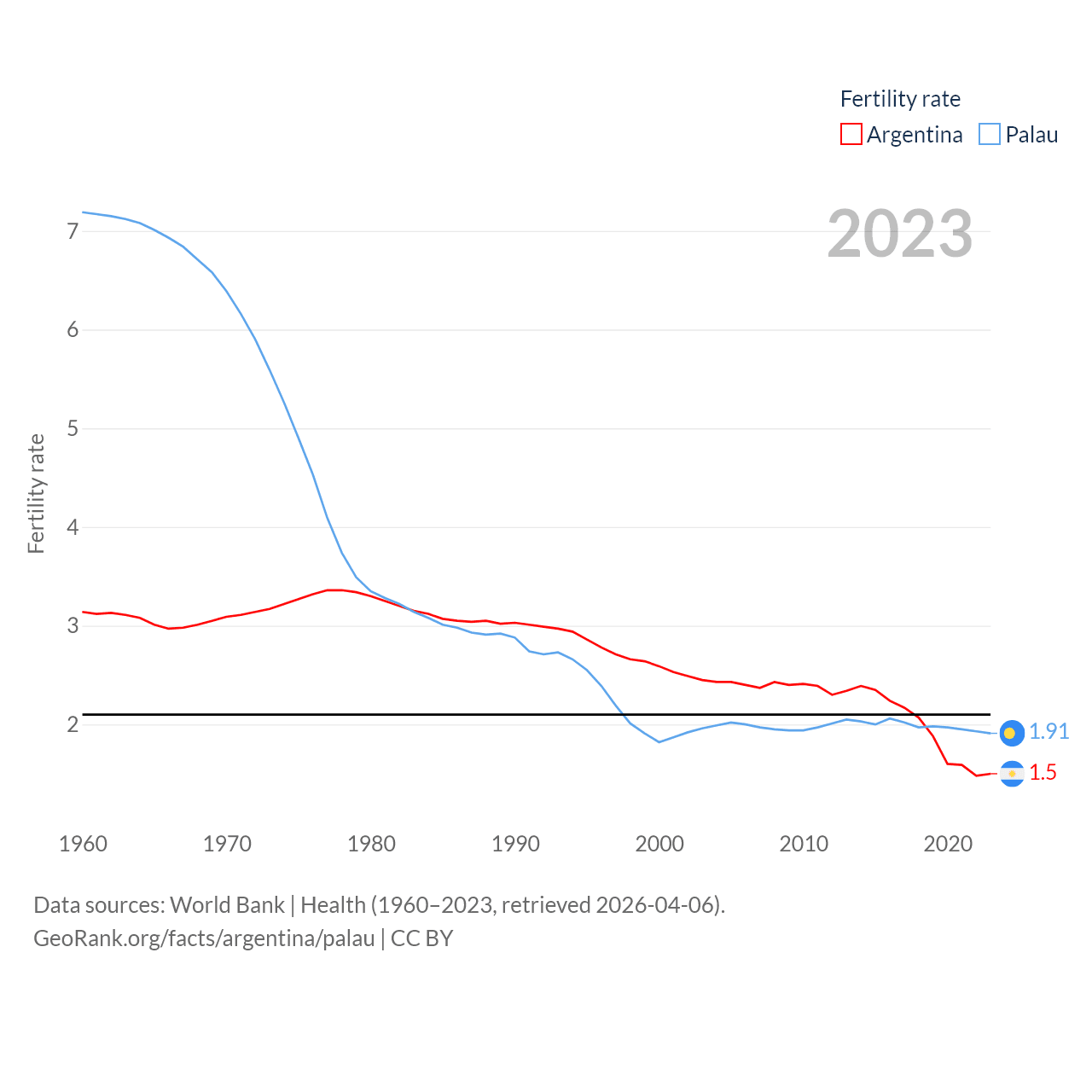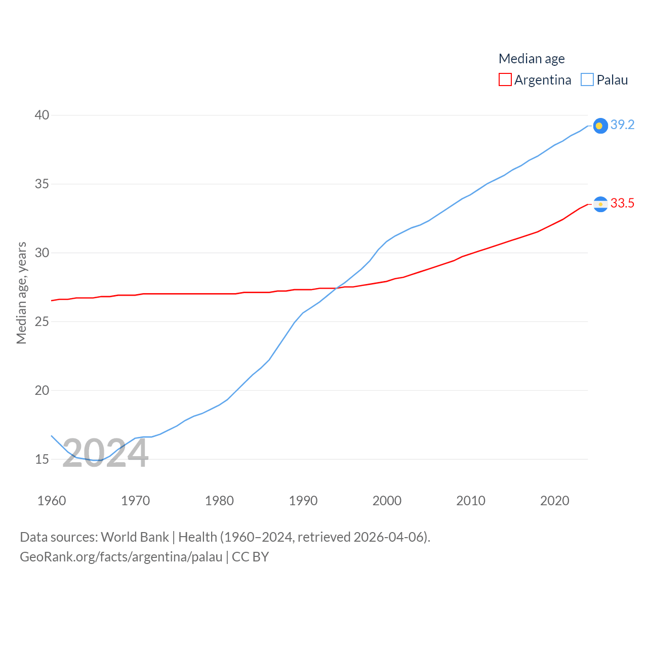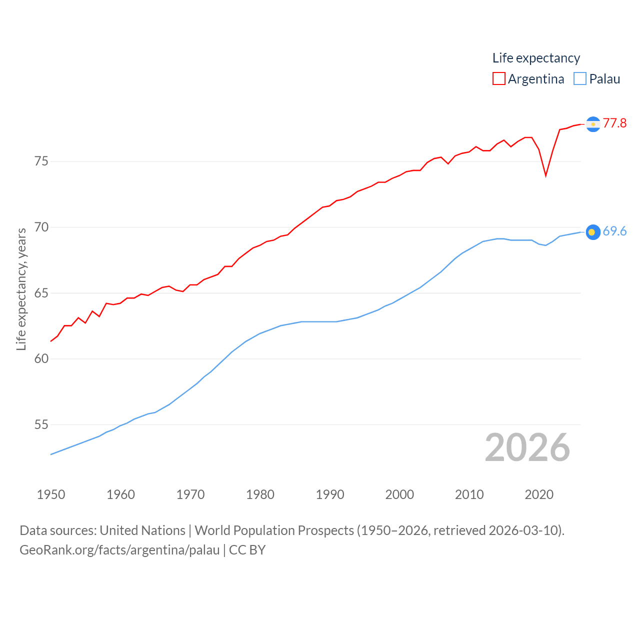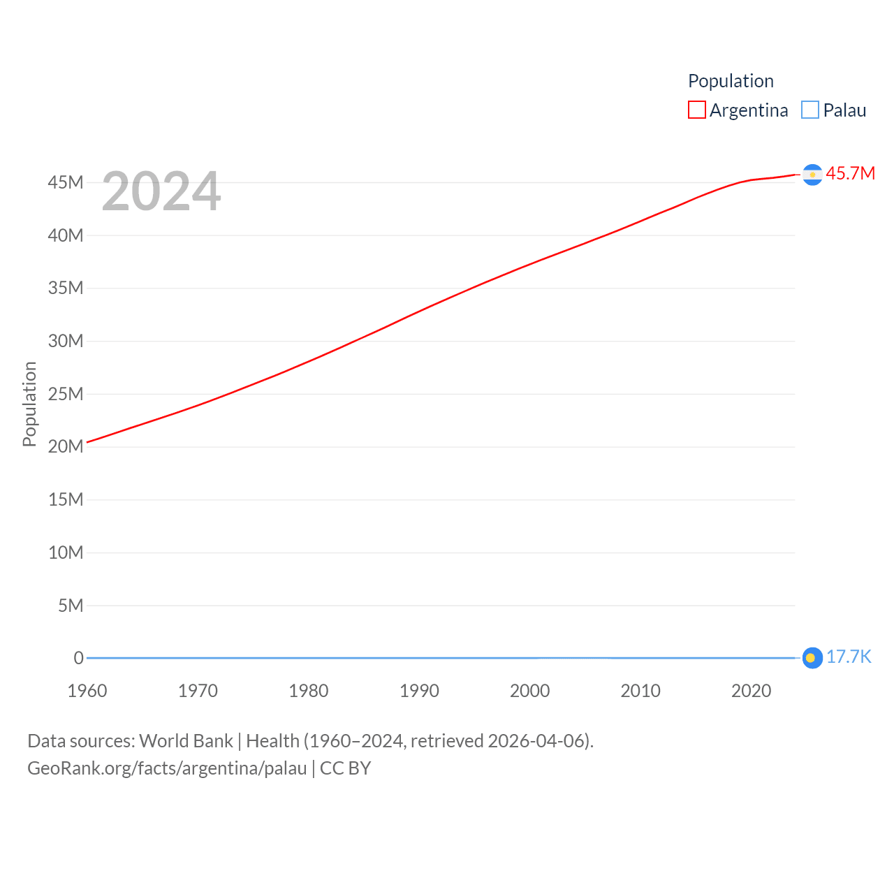 Argentina has a population of 45.7M (ranked 35/197), compared with 17.7K in Palau (ranked 194/197). Argentina's land area is 1,056,642 sq mi versus 177.6 sq mi for Palau (ranked 8th vs. 180th).