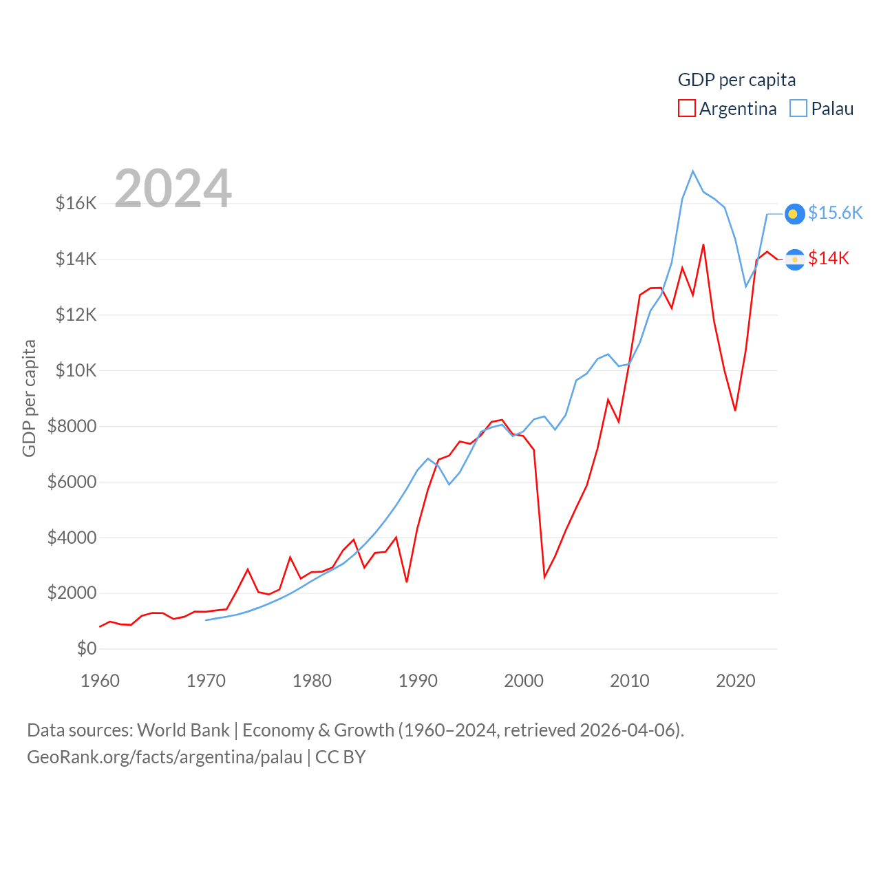 By GDP, Argentina ranks 24/197 ($638B) and Palau ranks 194/197 ($277M). By GDP per capita, Argentina ranks 72/197 ($13,970), while Palau ranks 67/197 ($15,611).