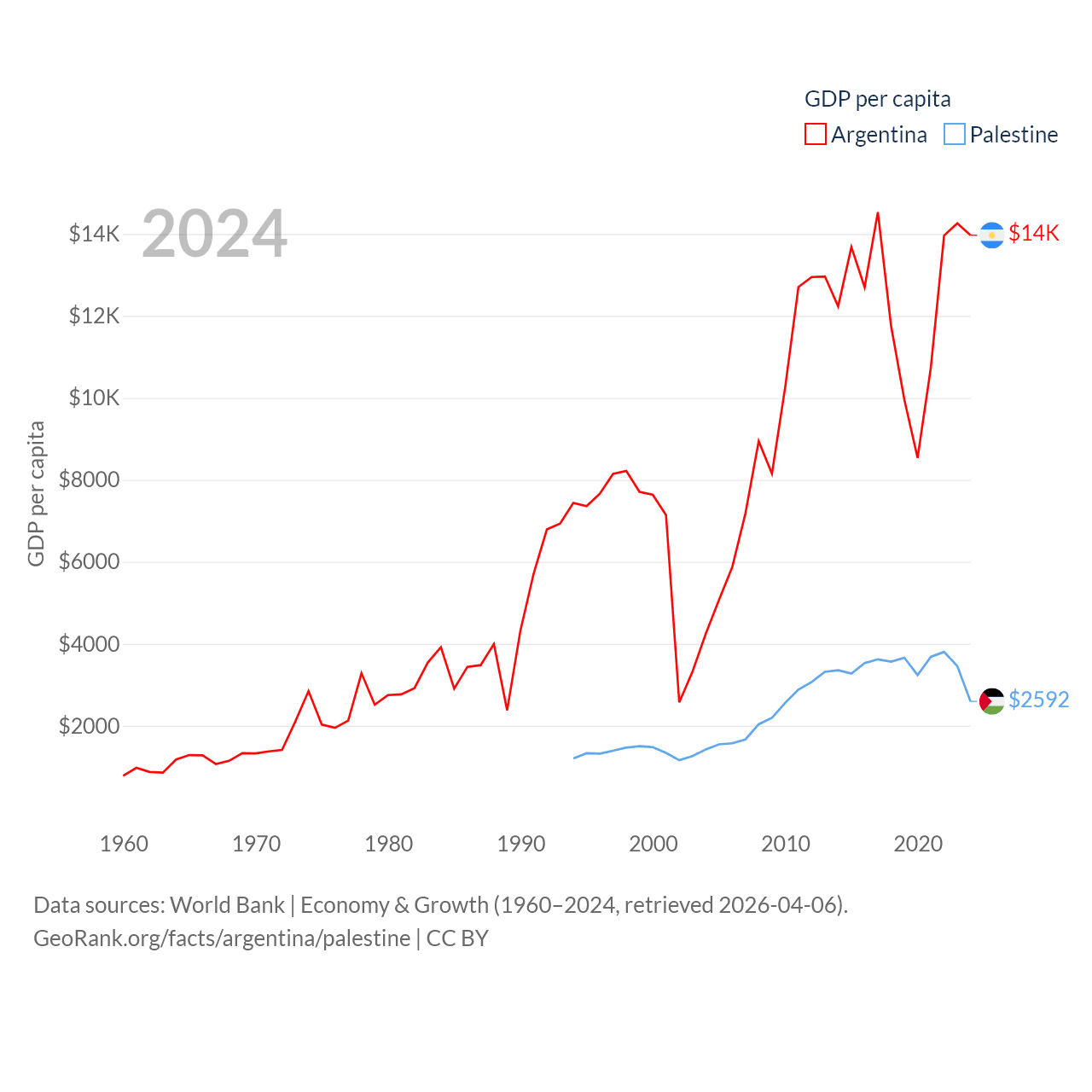 By GDP, Argentina ranks 24/197 ($638B) and Palestine ranks 146/197 ($13.7B). By GDP per capita, Argentina ranks 72/197 ($13,970), while Palestine ranks 147/197 ($2,592).