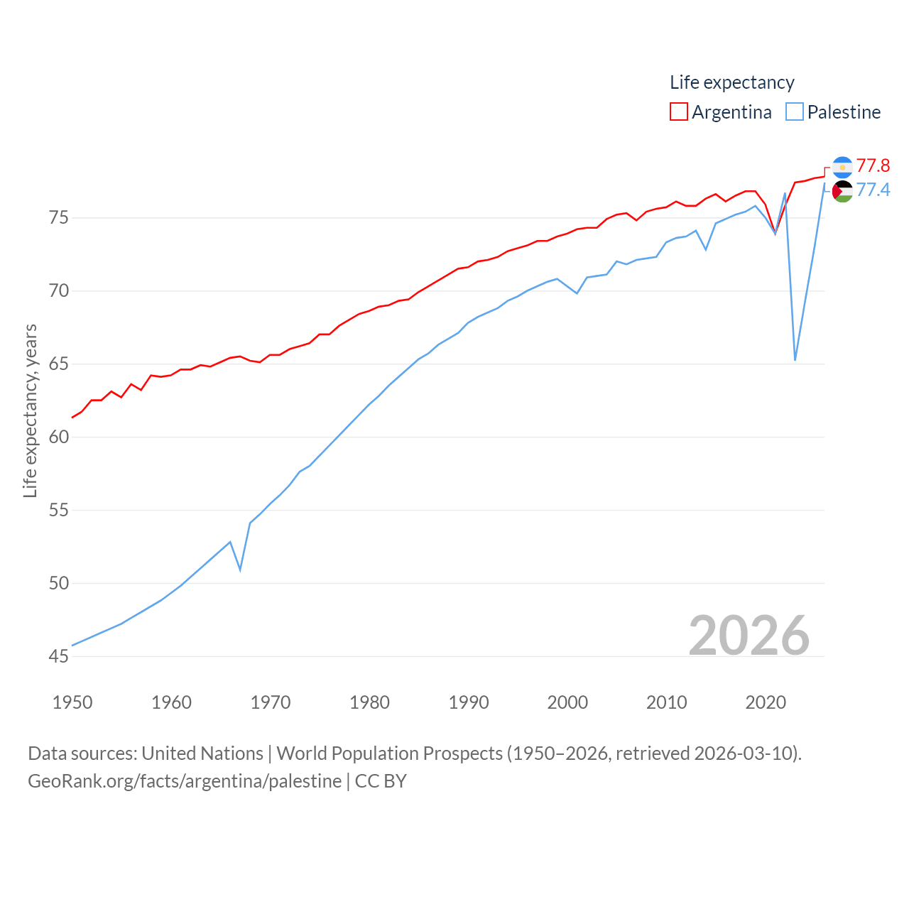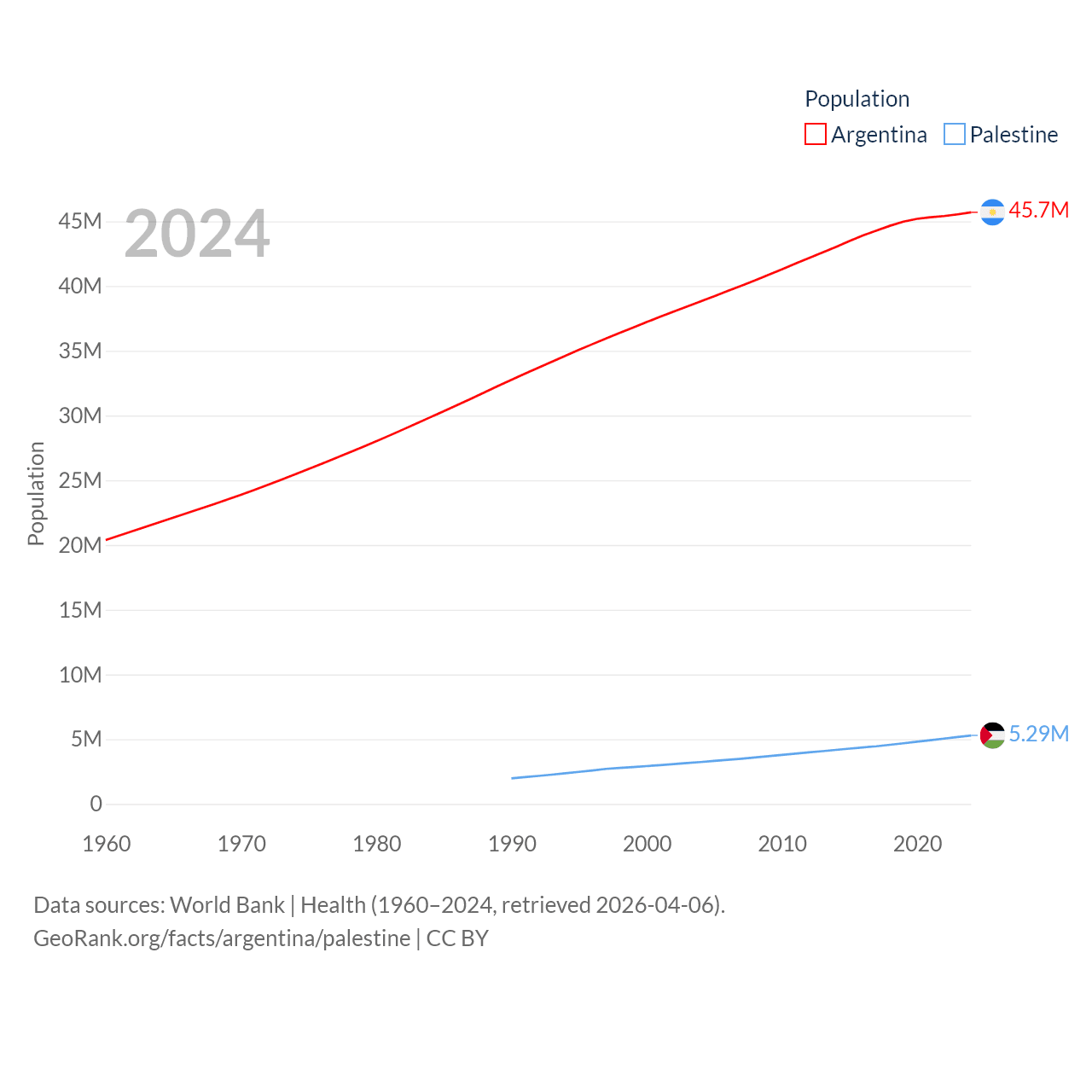 Argentina has a population of 45.7M (ranked 35/197), compared with 5.29M in Palestine (ranked 122/197). Argentina's land area is 1,056,642 sq mi versus 2,326 sq mi for Palestine (ranked 8th vs. 164th).