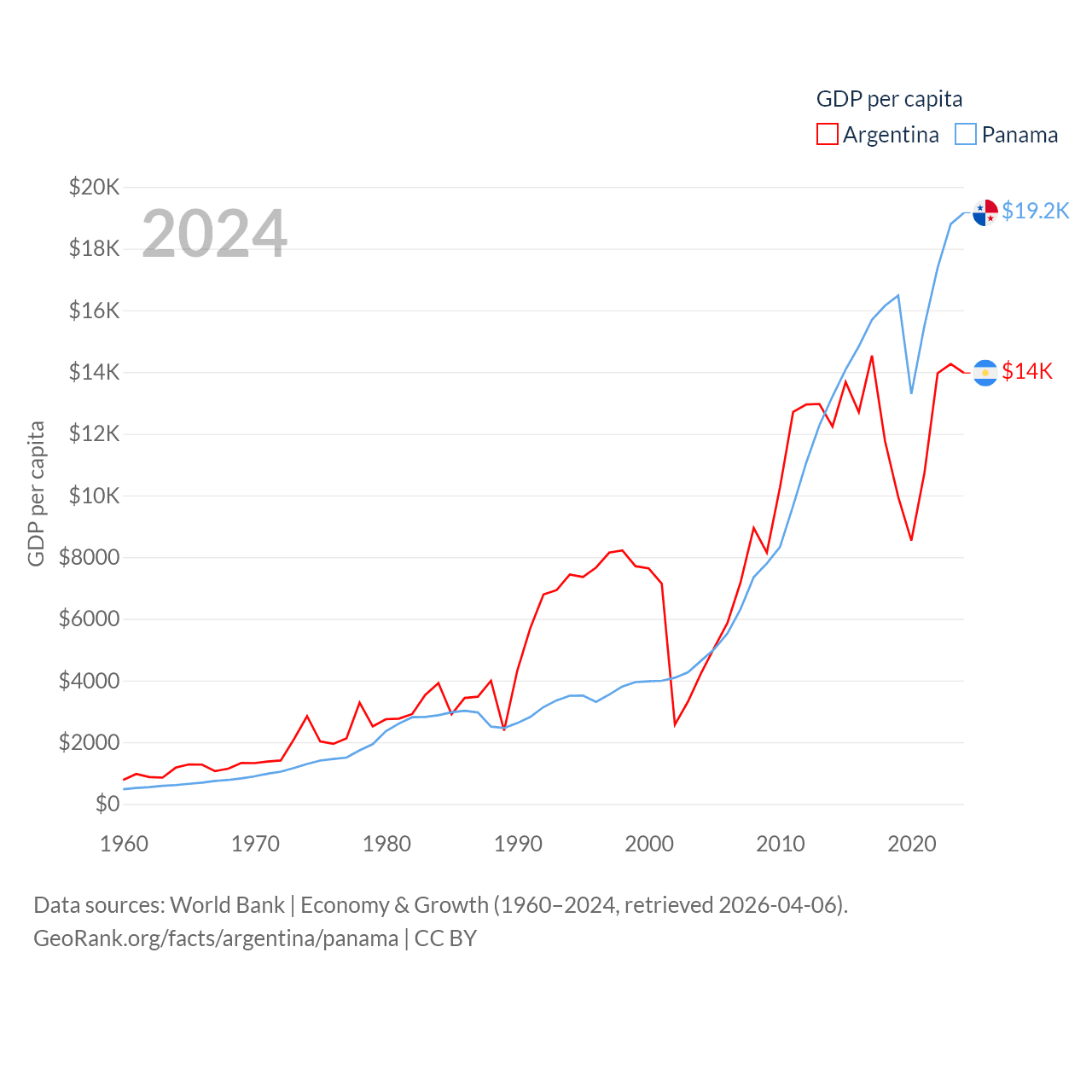 By GDP, Argentina ranks 24/197 ($638B) and Panama ranks 78/197 ($86.5B). By GDP per capita, Argentina ranks 72/197 ($13,970), while Panama ranks 60/197 ($19,161).