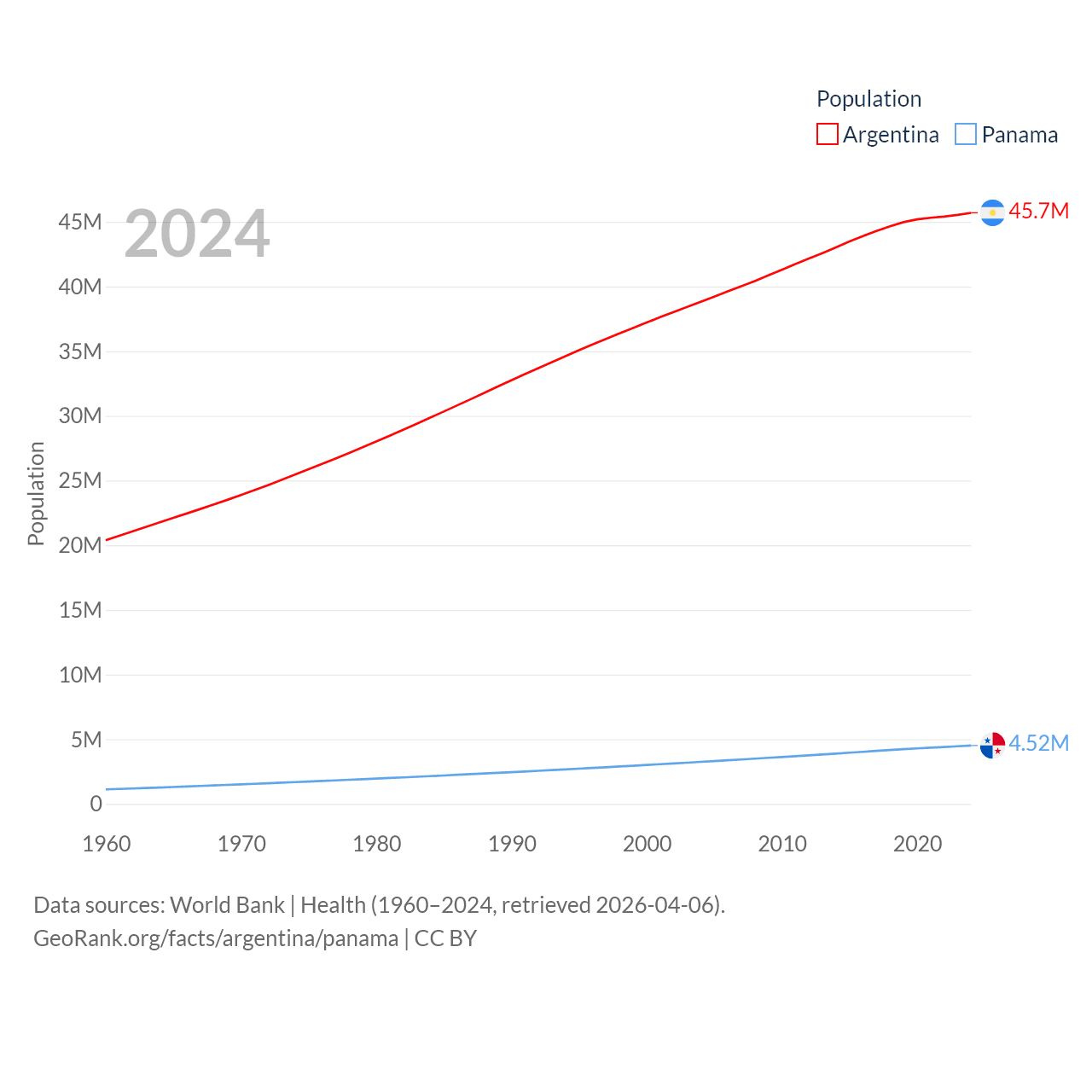 Argentina has a population of 45.7M (ranked 35/197), compared with 4.52M in Panama (ranked 128/197). Argentina's land area is 1,056,642 sq mi versus 28,641 sq mi for Panama (ranked 8th vs. 115th).