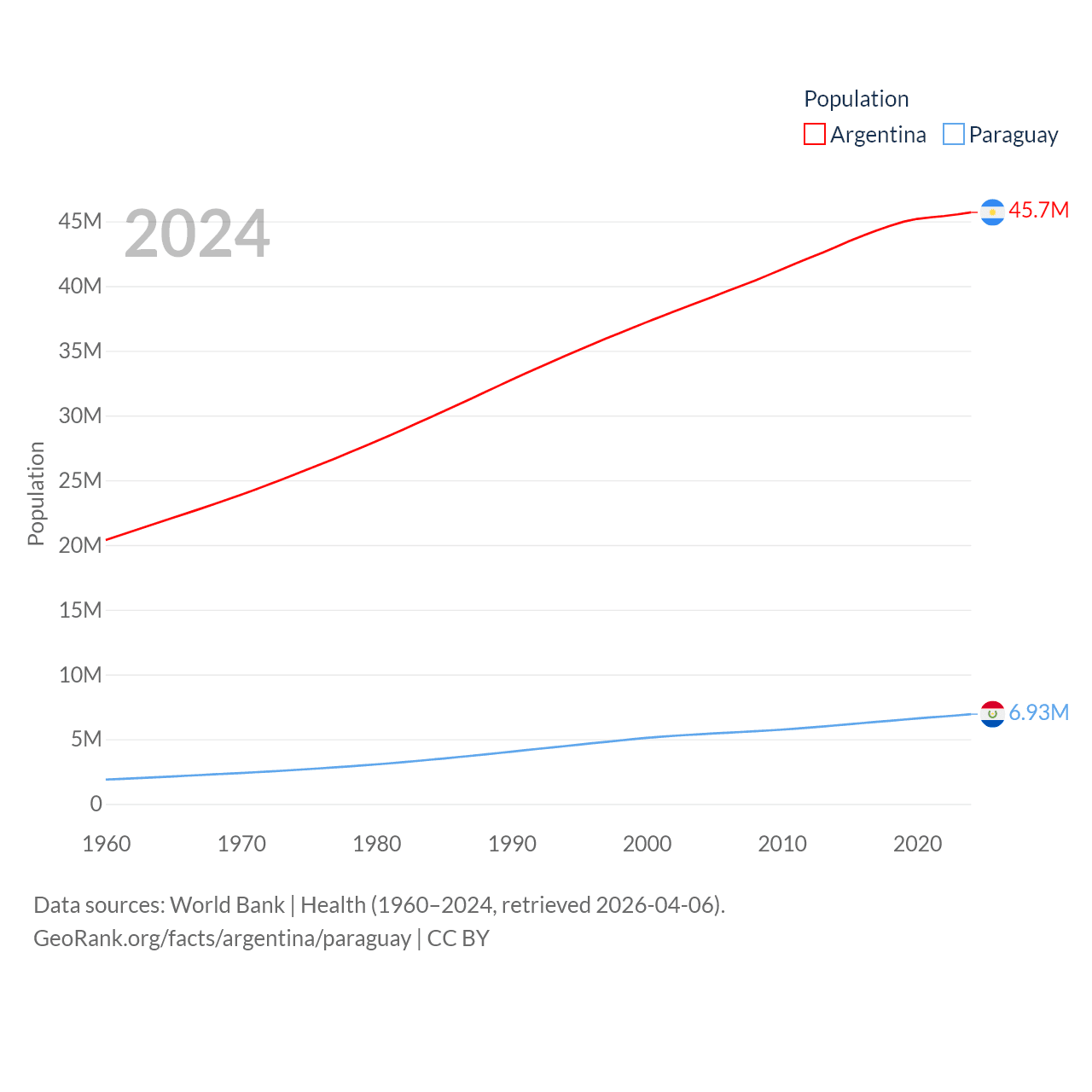 Argentina has a population of 45.7M (ranked 35/197), compared with 6.93M in Paraguay (ranked 107/197). Argentina's land area is 1,056,642 sq mi versus 152,901 sq mi for Paraguay (ranked 8th vs. 59th).