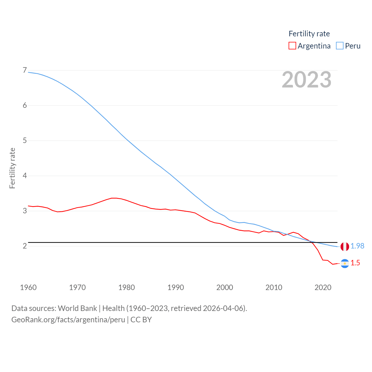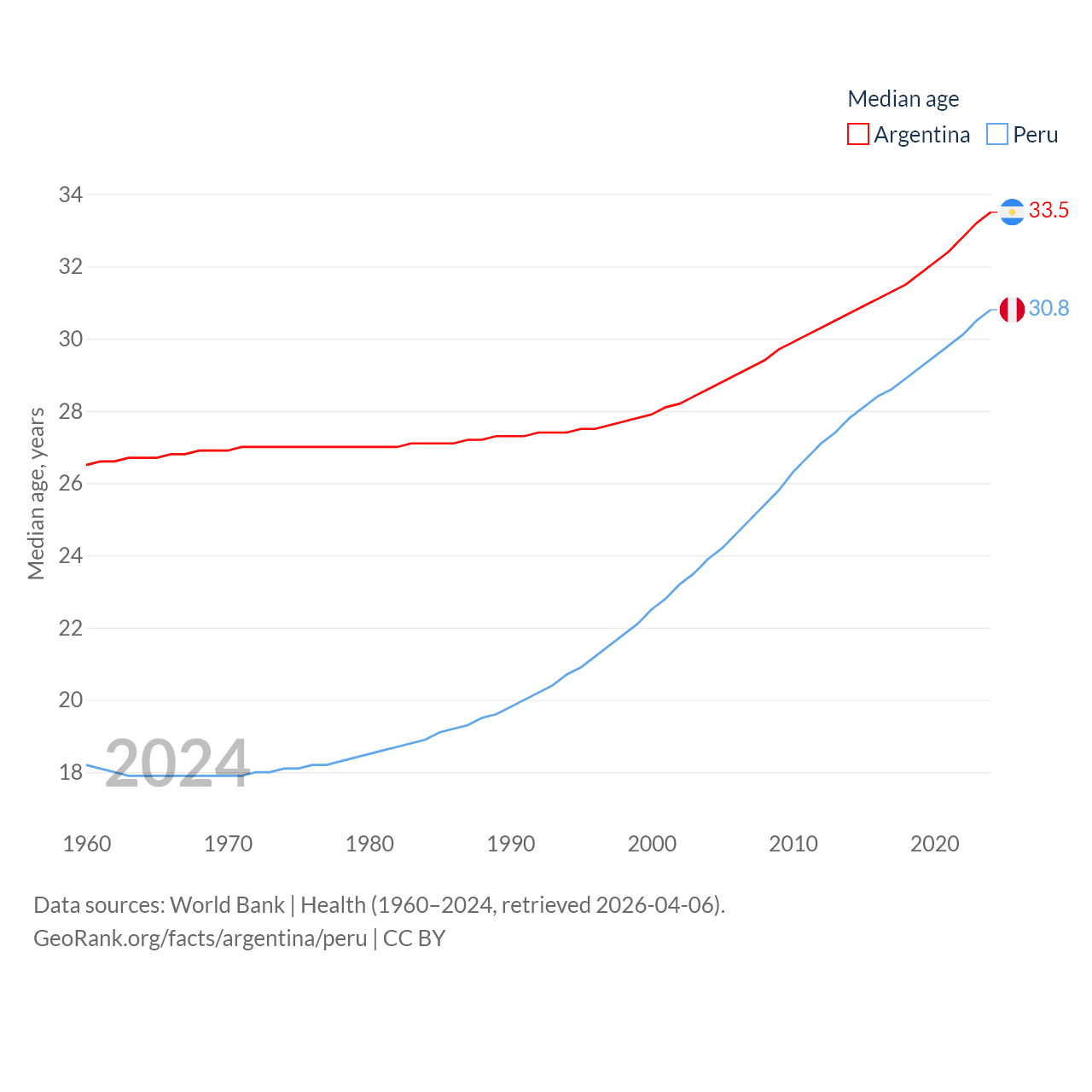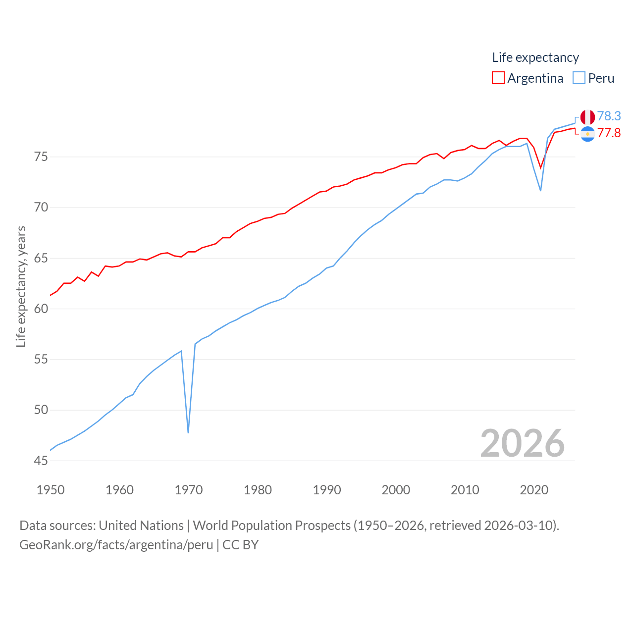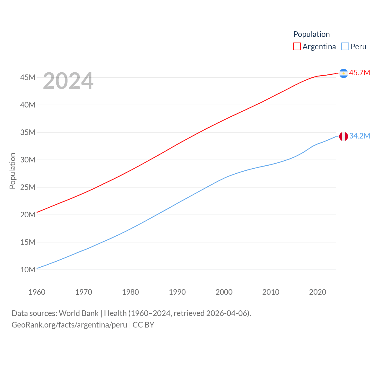 Argentina has a population of 45.7M (ranked 35/197), compared with 34.2M in Peru (ranked 48/197). Argentina's land area is 1,056,642 sq mi versus 494,211 sq mi for Peru (ranked 8th vs. 19th).
