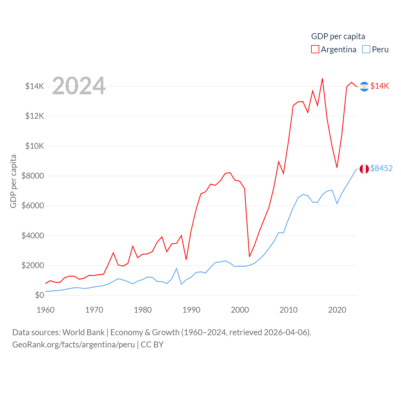 By GDP, Argentina ranks 24/197 ($638B) and Peru ranks 49/197 ($289B). By GDP per capita, Argentina ranks 72/197 ($13,970), while Peru ranks 91/197 ($8,452).