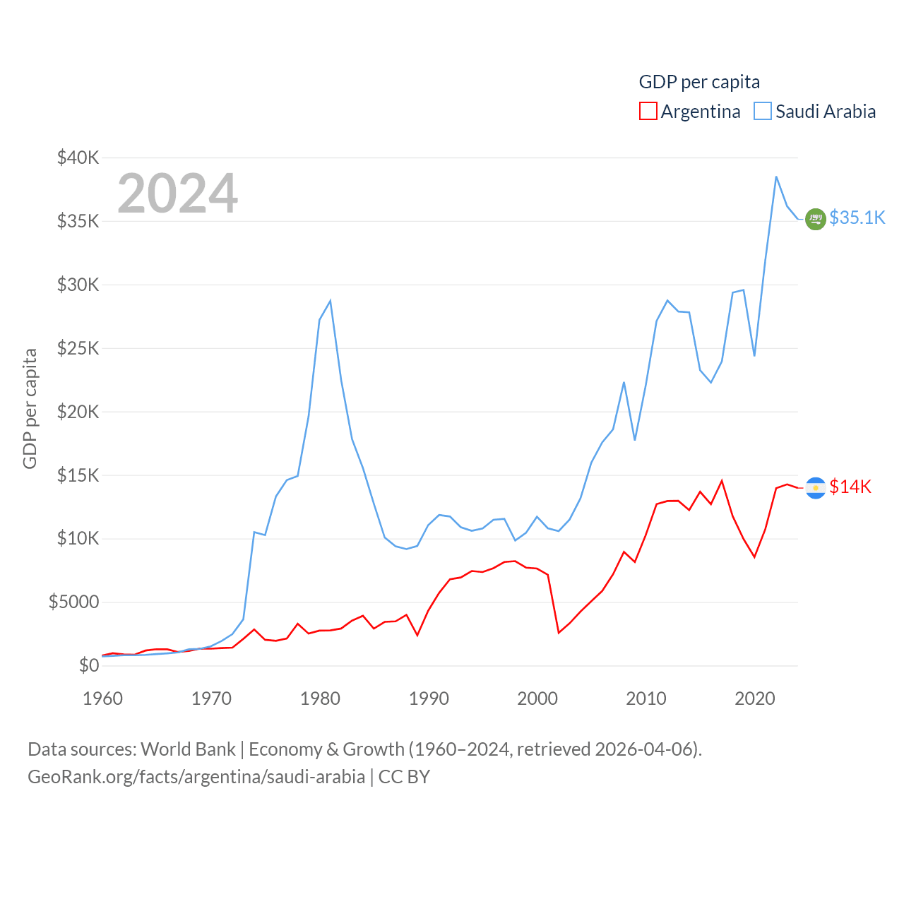By GDP, Argentina ranks 24/197 ($638B) and Saudi Arabia ranks 18/197 ($1.24T). By GDP per capita, Argentina ranks 72/197 ($13,970), while Saudi Arabia ranks 33/197 ($35,122).