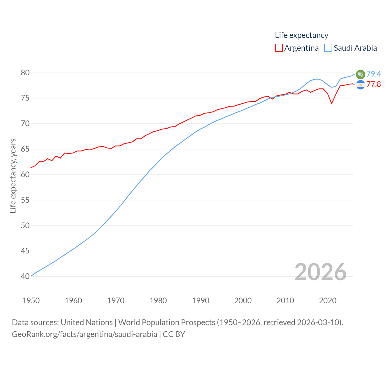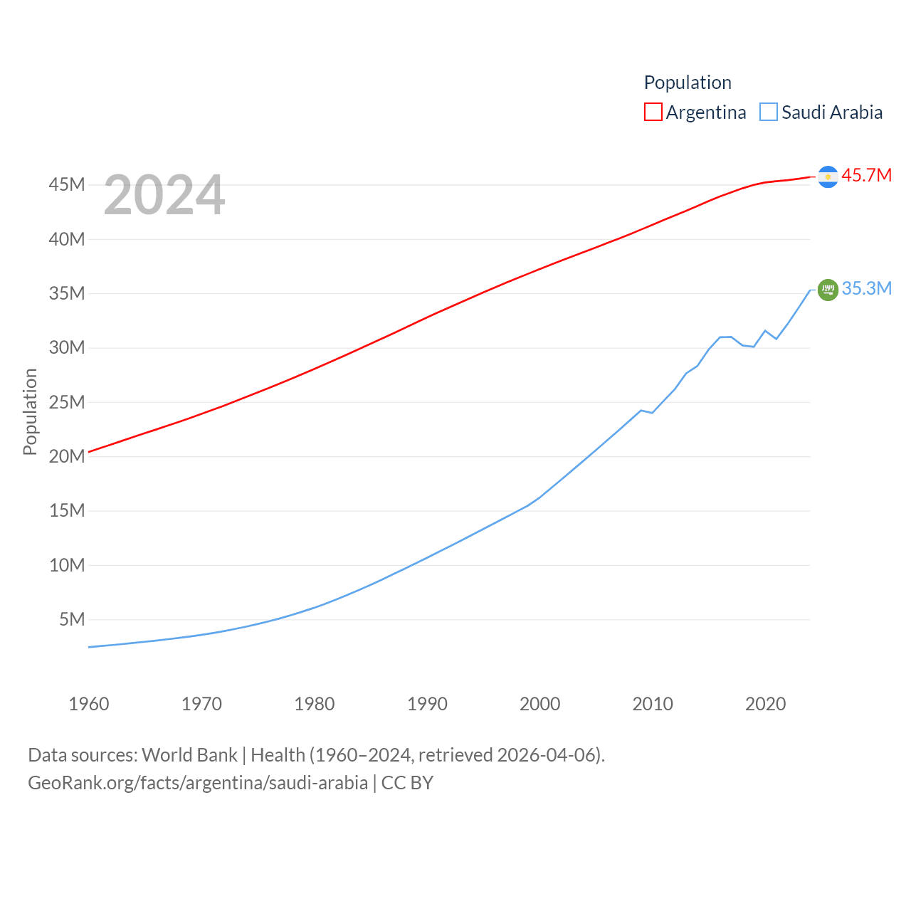 Argentina has a population of 45.7M (ranked 35/197), compared with 35.3M in Saudi Arabia (ranked 45/197). Argentina's land area is 1,056,642 sq mi versus 830,000 sq mi for Saudi Arabia (ranked 8th vs. 12th).