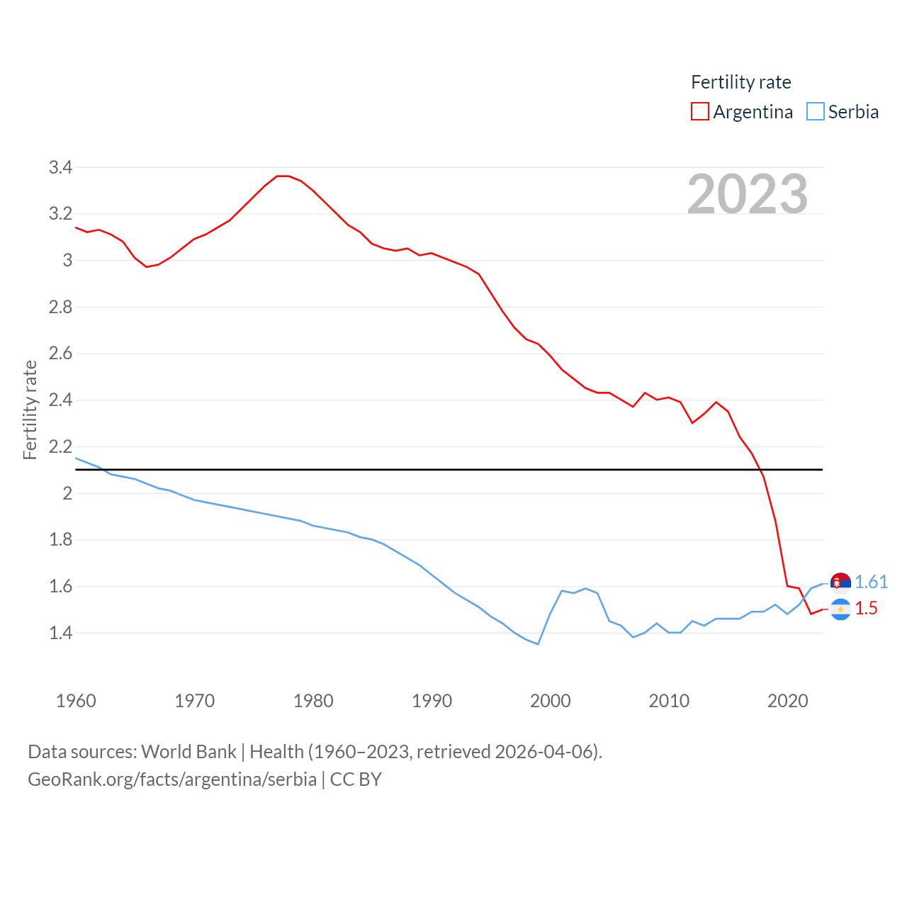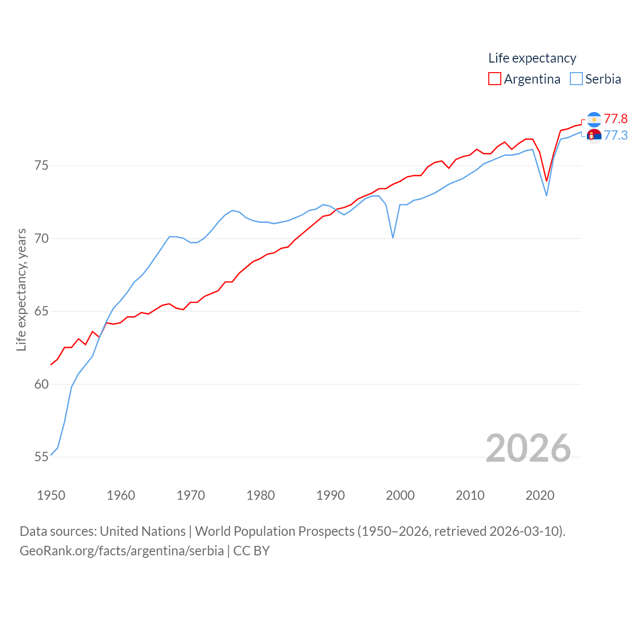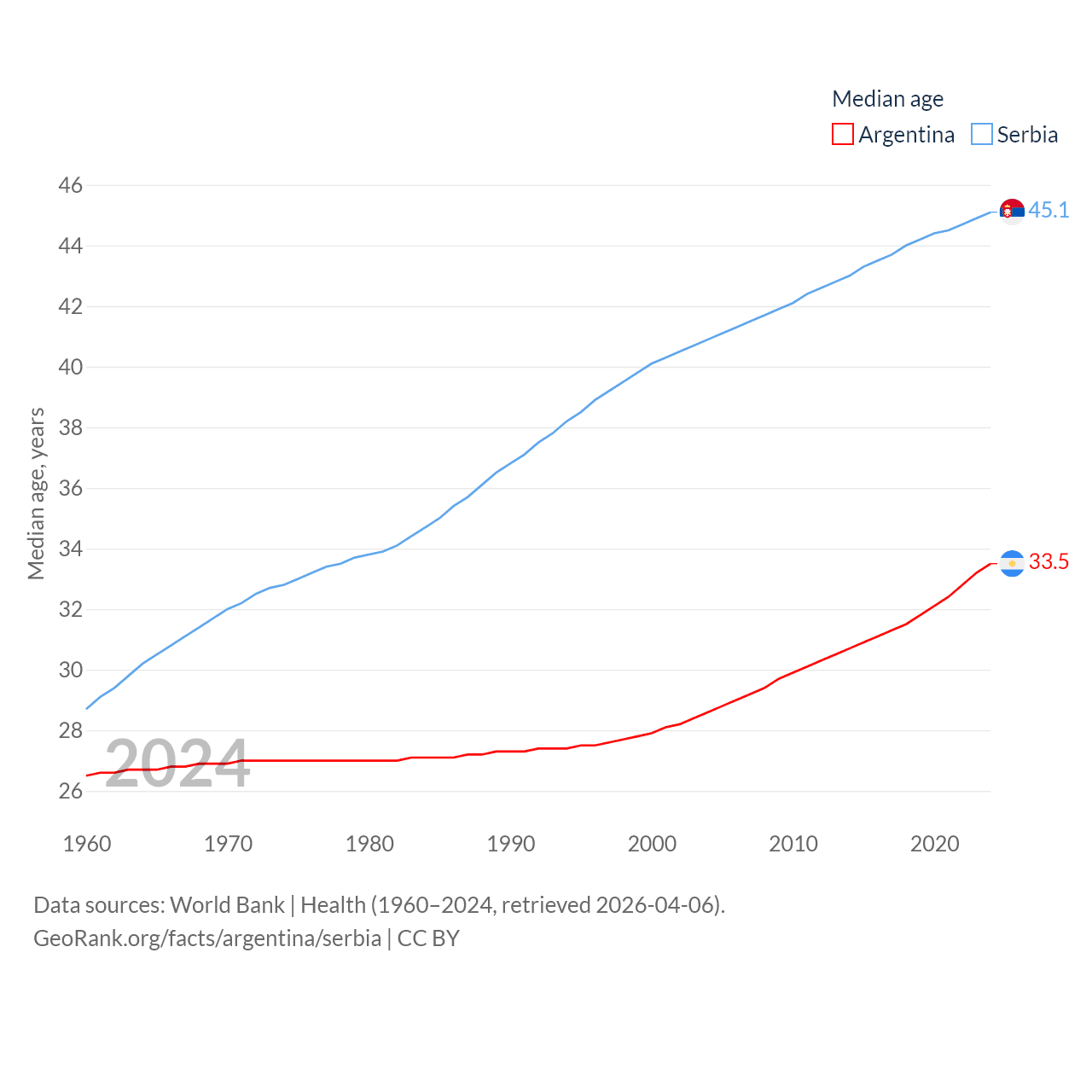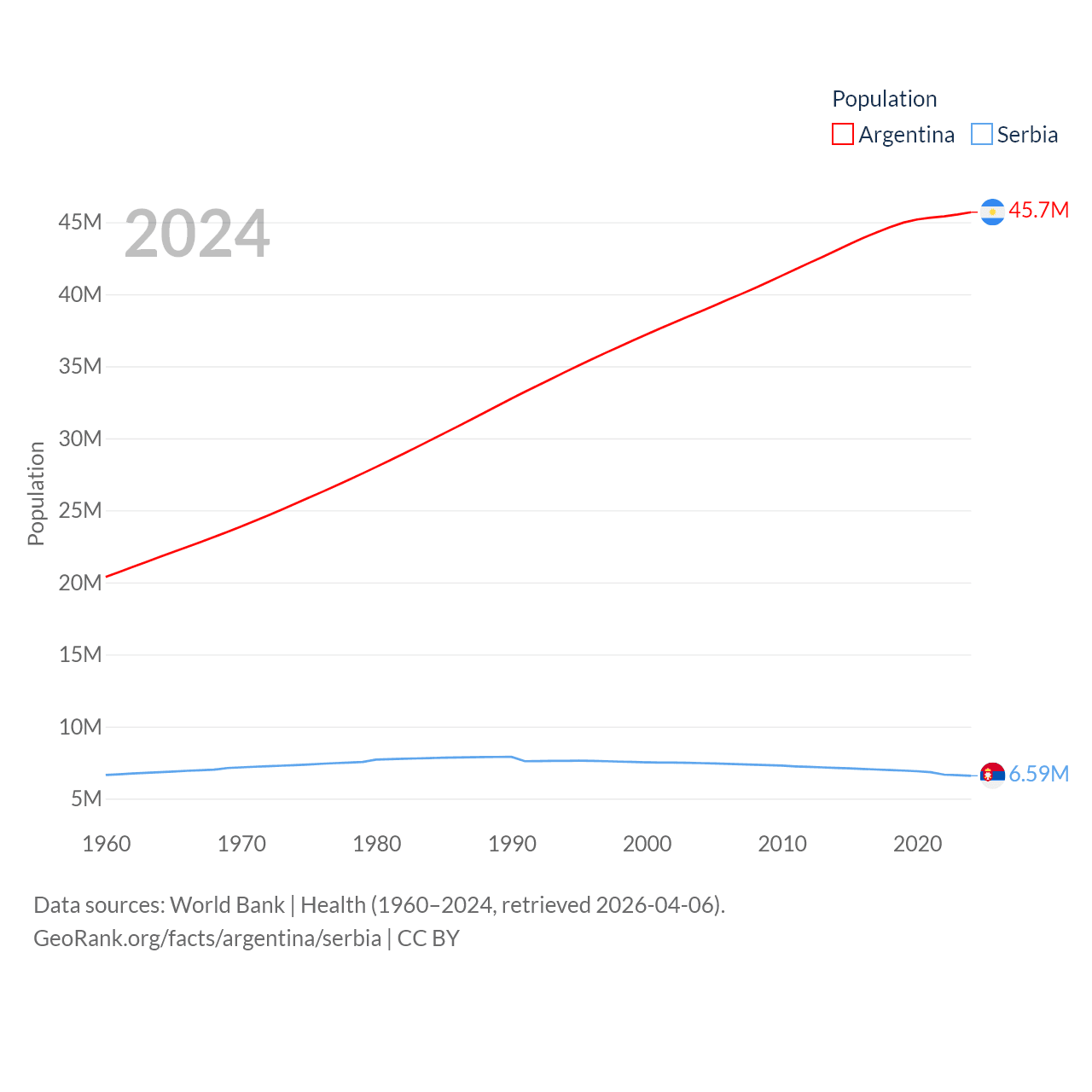 Argentina has a population of 45.7M (ranked 35/197), compared with 6.59M in Serbia (ranked 109/197). Argentina's land area is 1,056,642 sq mi versus 32,467 sq mi for Serbia (ranked 8th vs. 111th).