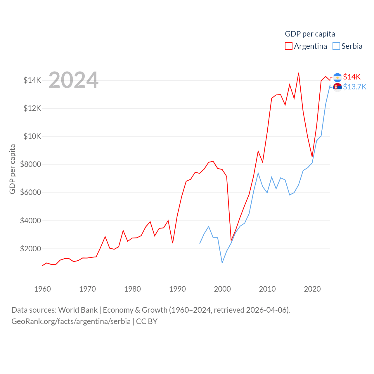 By GDP, Argentina ranks 24/197 ($638B) and Serbia ranks 76/197 ($90.1B). By GDP per capita, Argentina ranks 72/197 ($13,970), while Serbia ranks 73/197 ($13,679).
