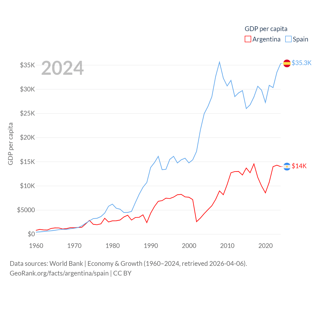 By GDP, Argentina ranks 24/197 ($638B) and Spain ranks 15/197 ($1.73T). By GDP per capita, Argentina ranks 72/197 ($13,970), while Spain ranks 32/197 ($35,327).