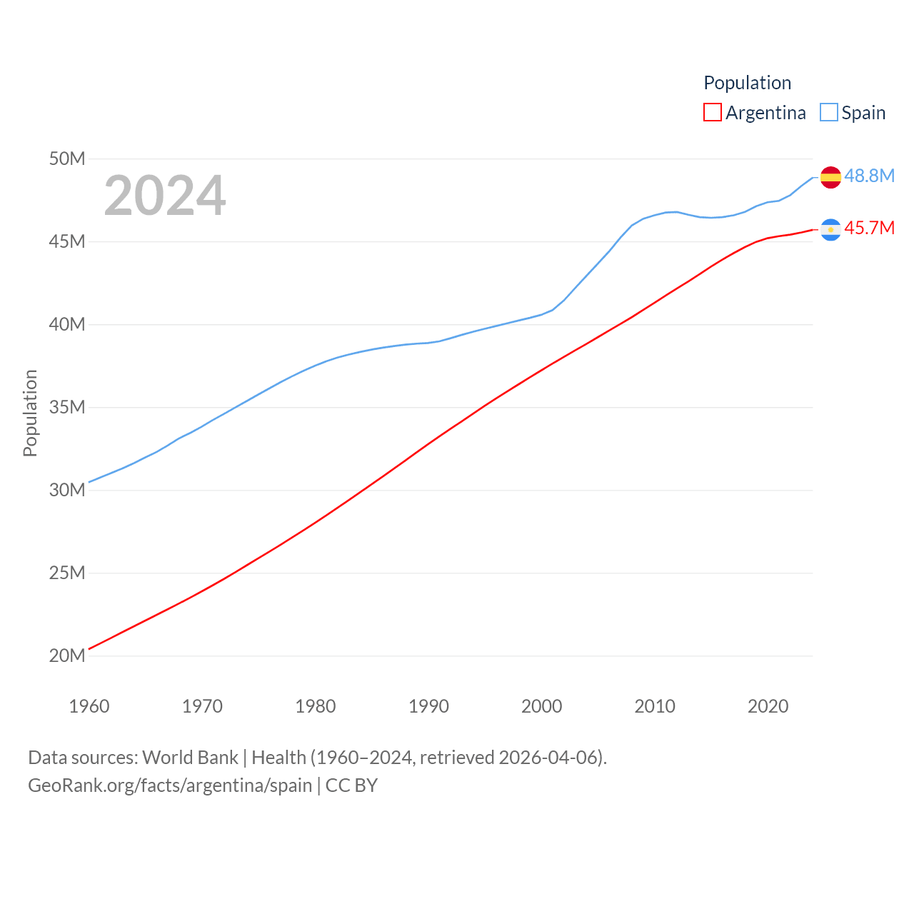Argentina has a population of 45.7M (ranked 35/197), compared with 48.8M in Spain (ranked 32/197). Argentina's land area is 1,056,642 sq mi versus 192,934 sq mi for Spain (ranked 8th vs. 51st).
