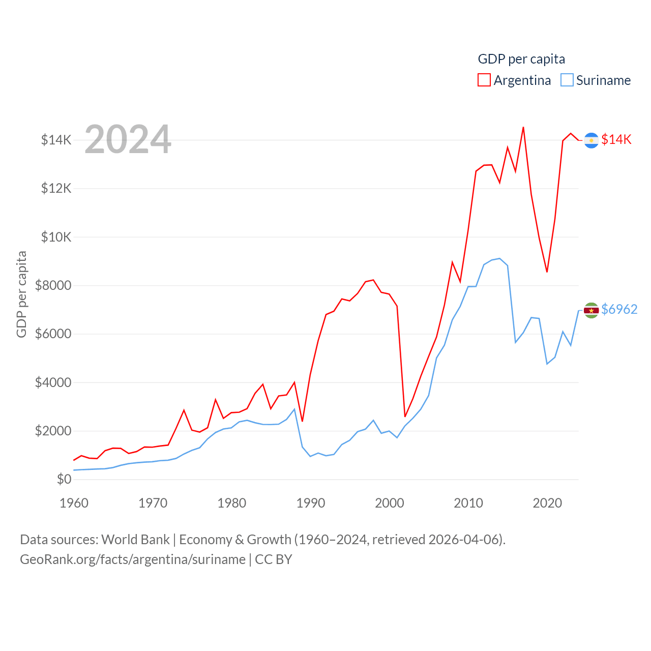 By GDP, Argentina ranks 24/197 ($638B) and Suriname ranks 164/197 ($4.42B). By GDP per capita, Argentina ranks 72/197 ($13,970), while Suriname ranks 102/197 ($6,962).
