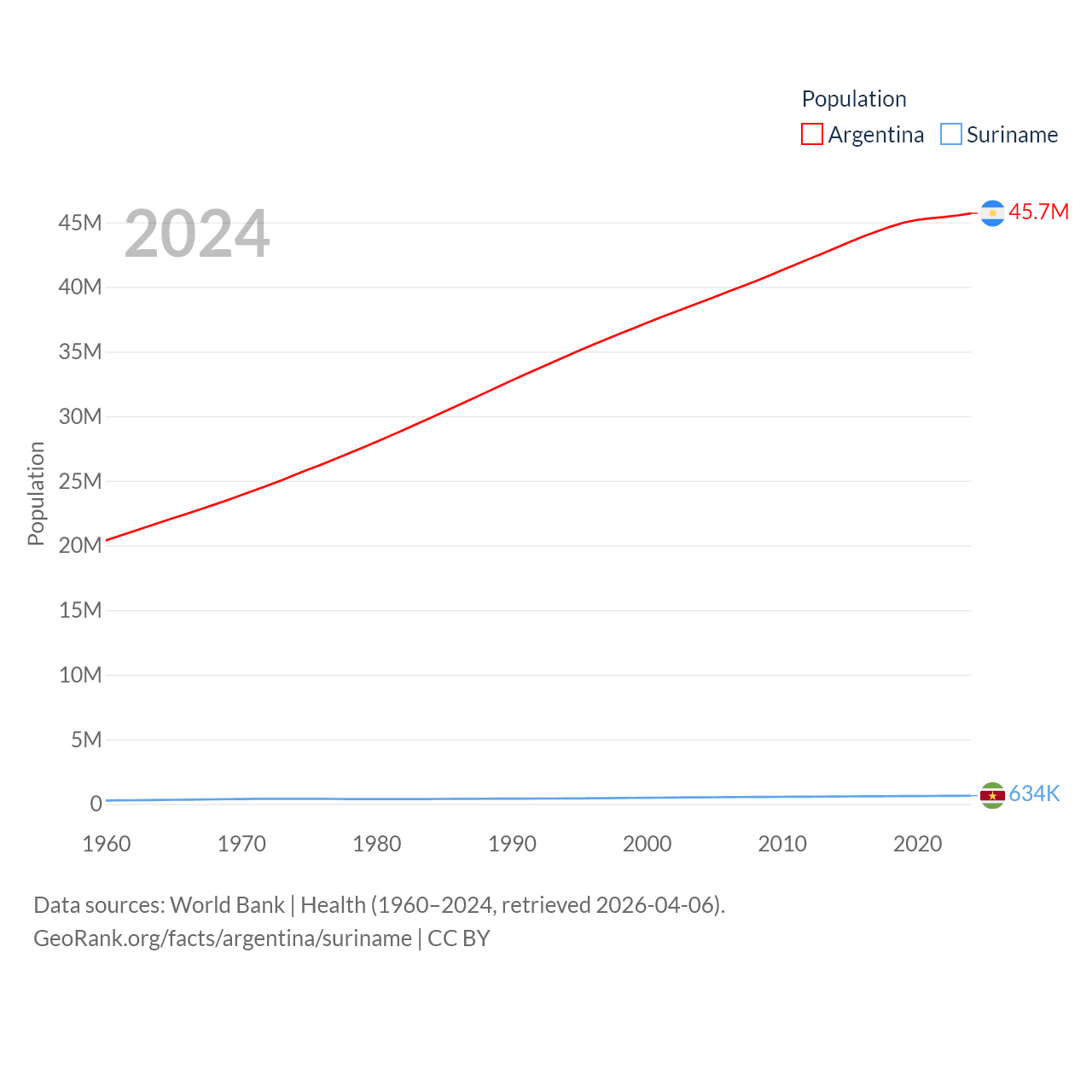 Argentina has a population of 45.7M (ranked 35/197), compared with 634K in Suriname (ranked 165/197). Argentina's land area is 1,056,642 sq mi versus 61,972 sq mi for Suriname (ranked 8th vs. 90th).