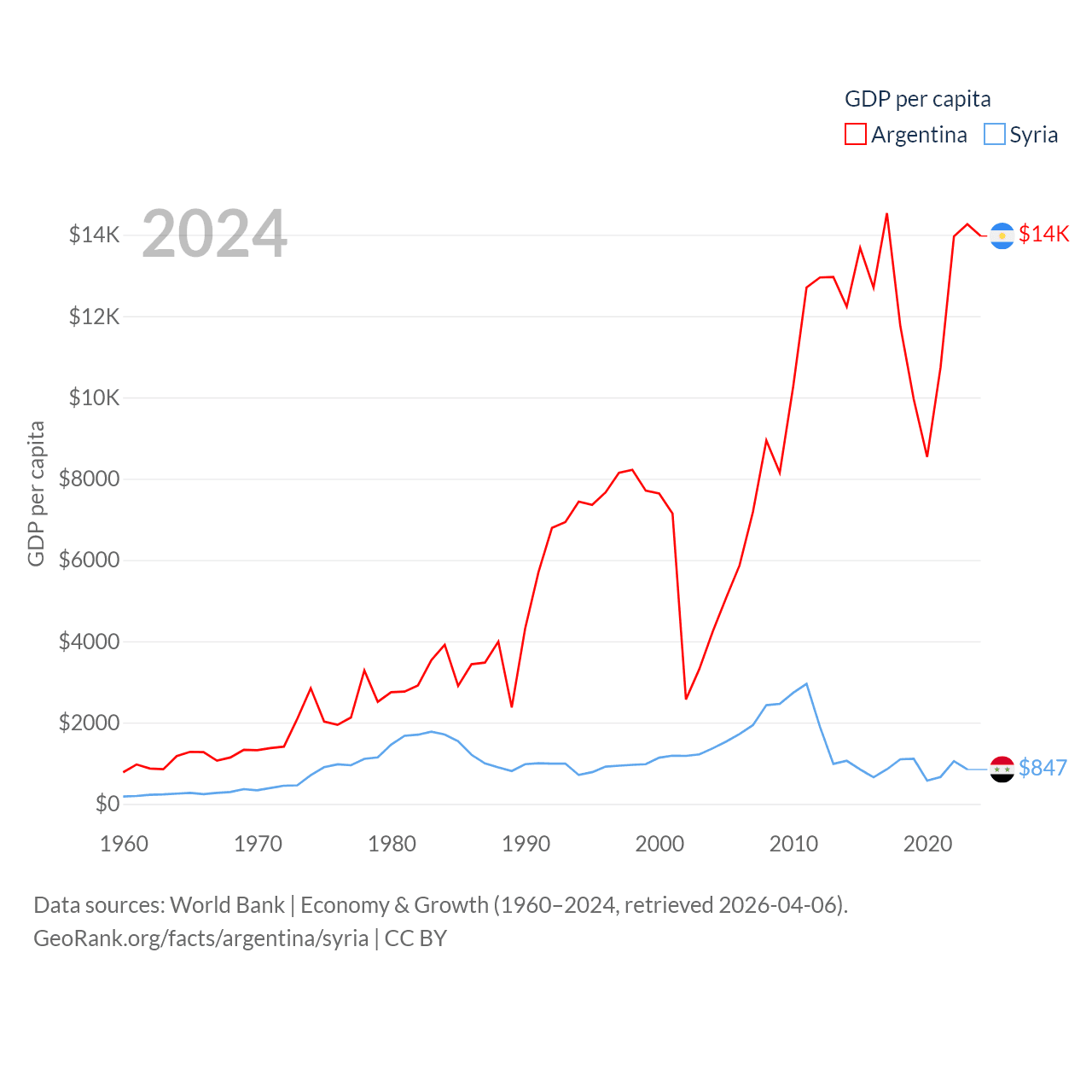 By GDP, Argentina ranks 24/197 ($638B) and Syria ranks 129/197 ($20B). By GDP per capita, Argentina ranks 72/197 ($13,970), while Syria ranks 185/197 ($847).