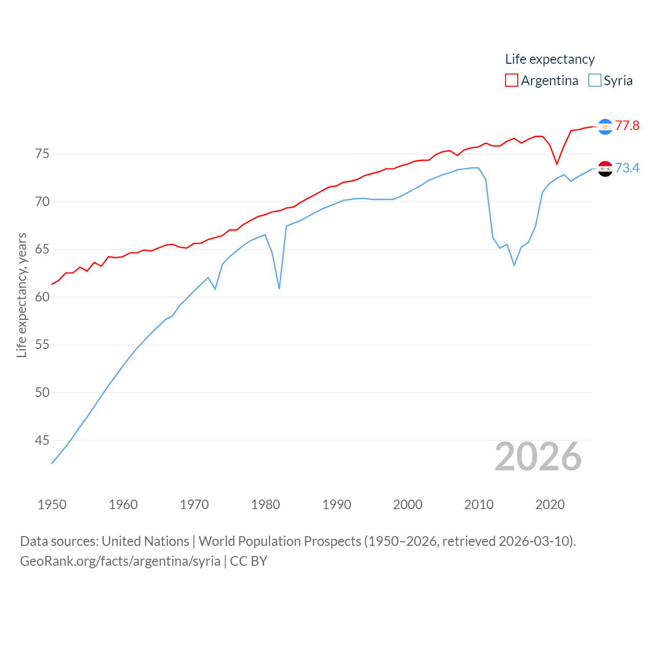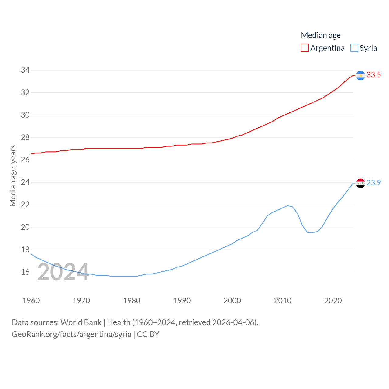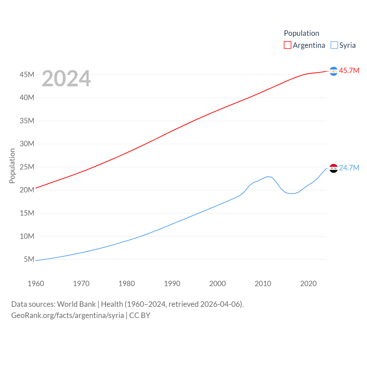 Argentina has a population of 45.7M (ranked 35/197), compared with 24.7M in Syria (ranked 57/197). Argentina's land area is 1,056,642 sq mi versus 70,900 sq mi for Syria (ranked 8th vs. 87th).