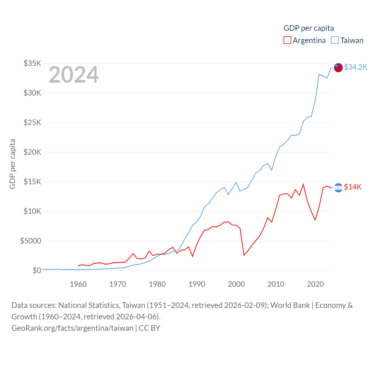 By GDP, Argentina ranks 24/197 ($638B) and Taiwan ranks 22/197 ($802B). By GDP per capita, Argentina ranks 72/197 ($13,970), while Taiwan ranks 35/197 ($34,238).