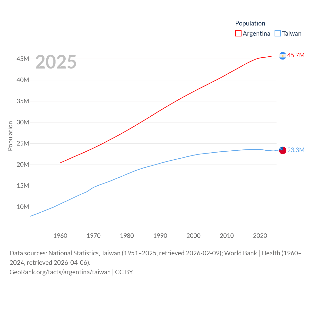 Argentina has a population of 45.7M (ranked 35/197), compared with 23.3M in Taiwan (ranked 60/197). Argentina's land area is 1,056,642 sq mi versus 13,976 sq mi for Taiwan (ranked 8th vs. 133rd).