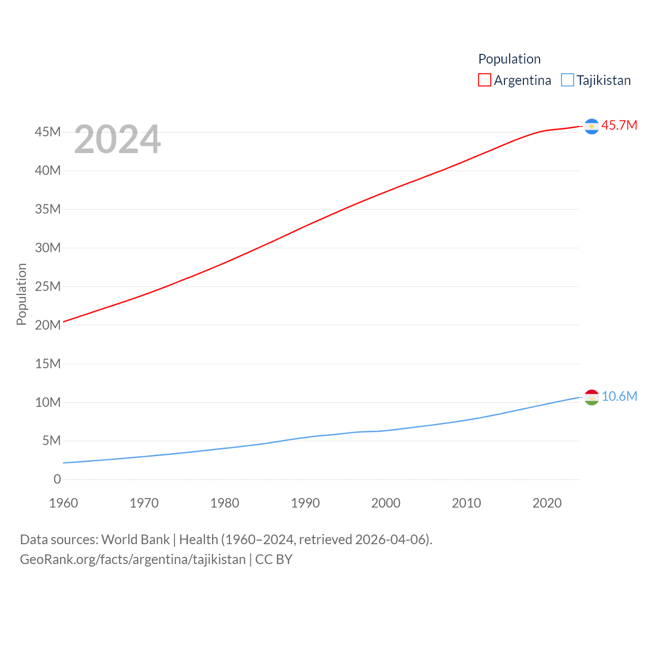 Argentina has a population of 45.7M (ranked 35/197), compared with 10.6M in Tajikistan (ranked 91/197). Argentina's land area is 1,056,642 sq mi versus 53,587 sq mi for Tajikistan (ranked 8th vs. 93rd).