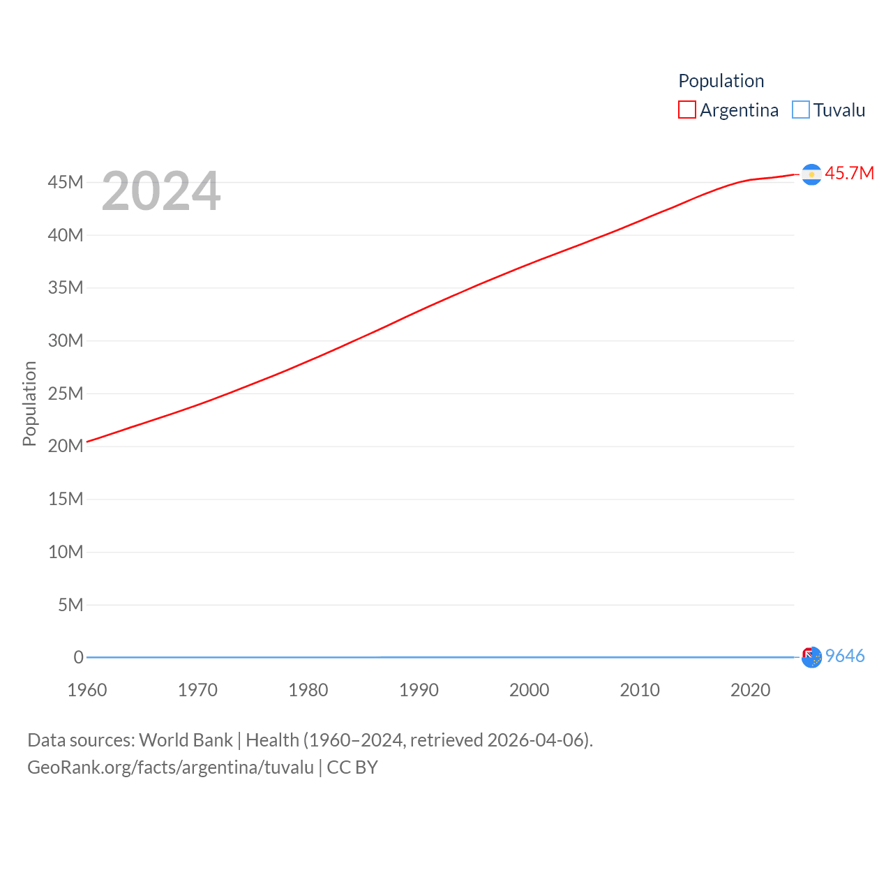 Argentina has a population of 45.7M (ranked 35/197), compared with 9.65K in Tuvalu (ranked 196/197). Argentina's land area is 1,056,642 sq mi versus 11.6 sq mi for Tuvalu (ranked 8th vs. 194th).