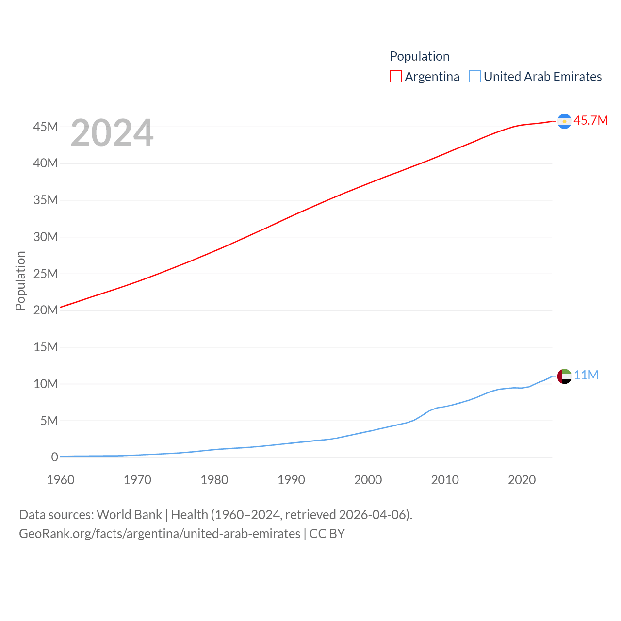 Argentina has a population of 45.7M (ranked 35/197), compared with 11M in The United Arab Emirates (ranked 86/197). Argentina's land area is 1,056,642 sq mi versus 27,421 sq mi for The United Arab Emirates (ranked 8th vs. 117th).