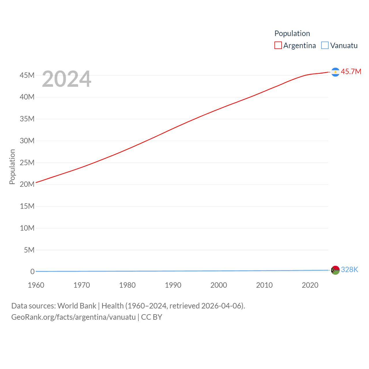 Argentina has a population of 45.7M (ranked 35/197), compared with 328K in Vanuatu (ranked 174/197). Argentina's land area is 1,056,642 sq mi versus 4,707 sq mi for Vanuatu (ranked 8th vs. 157th).