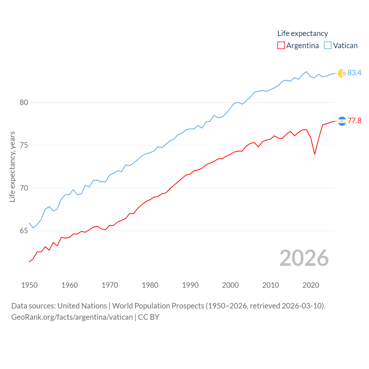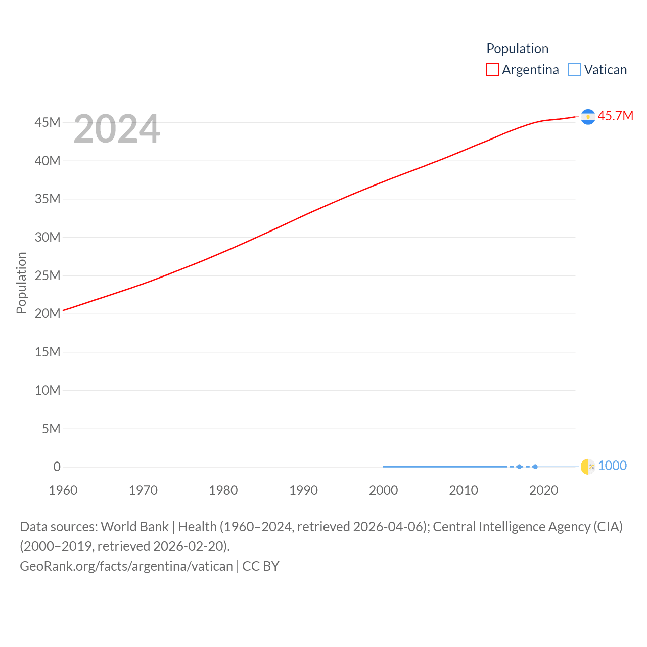 Argentina has a population of 45.7M (ranked 35/197), compared with 1K in The Vatican (ranked 197/197). Argentina's land area is 1,056,642 sq mi versus 0.17 sq mi for The Vatican (ranked 8th vs. 197th).