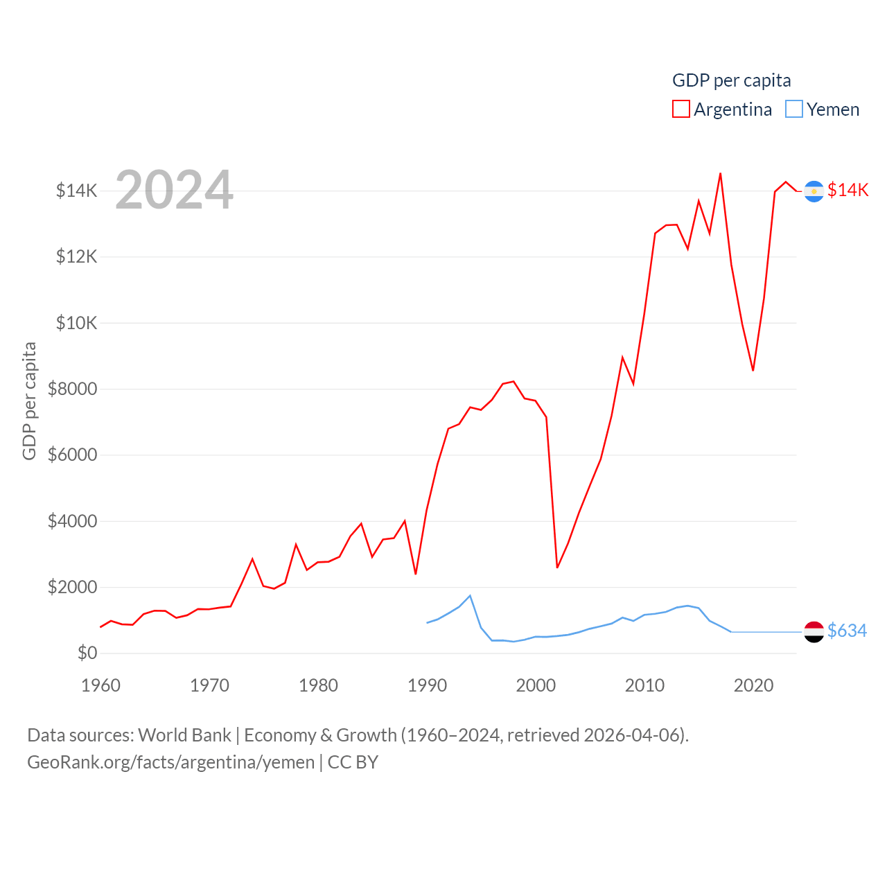 By GDP, Argentina ranks 24/197 ($638B) and Yemen ranks 125/197 ($21.6B). By GDP per capita, Argentina ranks 72/197 ($13,970), while Yemen ranks 191/197 ($634).