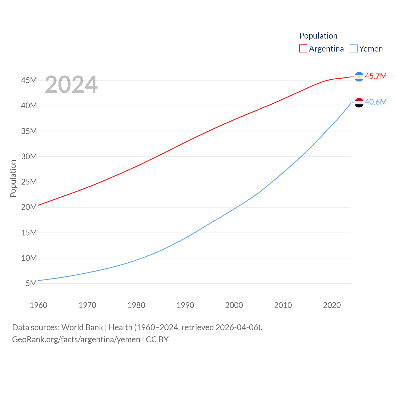 Argentina has a population of 45.7M (ranked 35/197), compared with 40.6M in Yemen (ranked 38/197). Argentina's land area is 1,056,642 sq mi versus 203,850 sq mi for Yemen (ranked 8th vs. 49th).