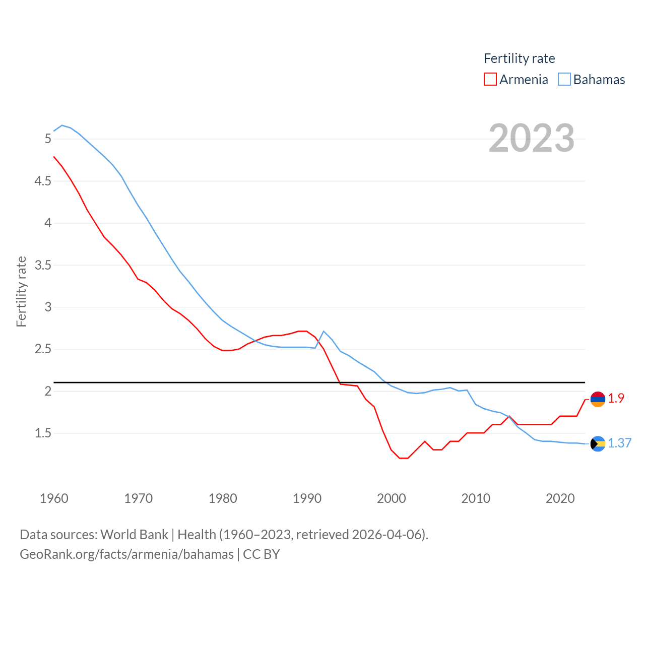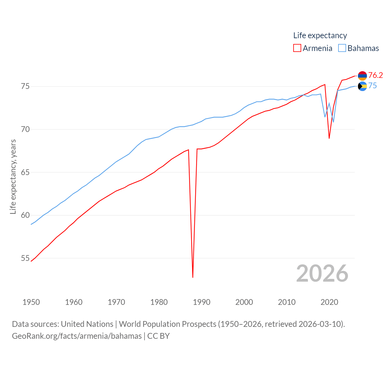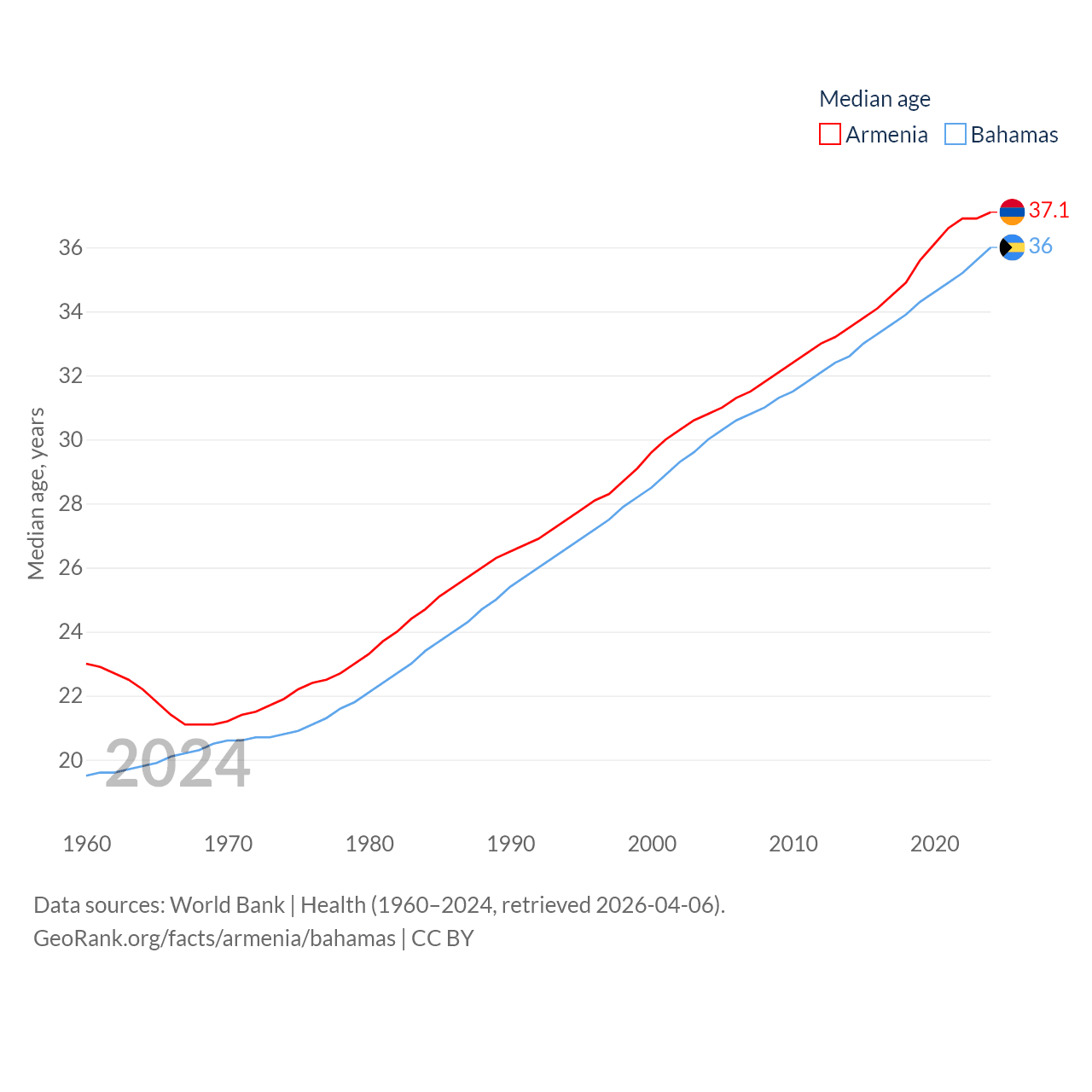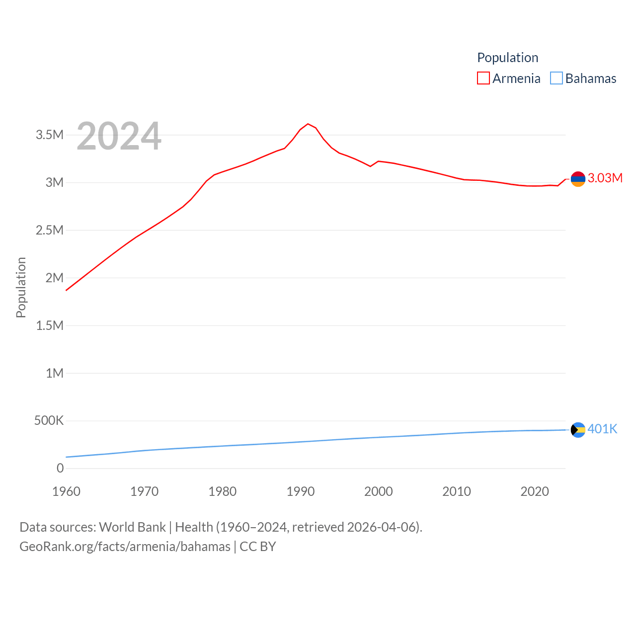 Armenia has a population of 3.03M (ranked 135/197), compared with 401K in The Bahamas (ranked 172/197). Armenia's land area is 10,888 sq mi versus 3,865 sq mi for The Bahamas (ranked 138th vs. 162nd).