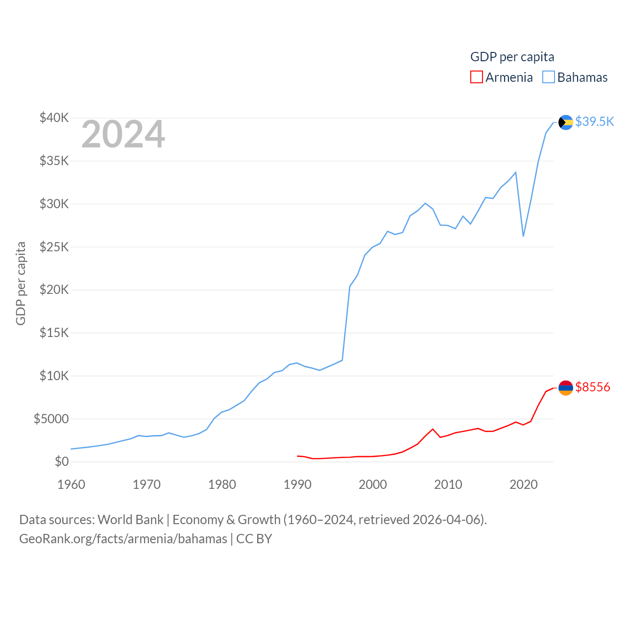 By GDP, Armenia ranks 114/197 ($26B) and The Bahamas ranks 140/197 ($15.8B). By GDP per capita, Armenia ranks 90/197 ($8,556), while The Bahamas ranks 30/197 ($39,455).