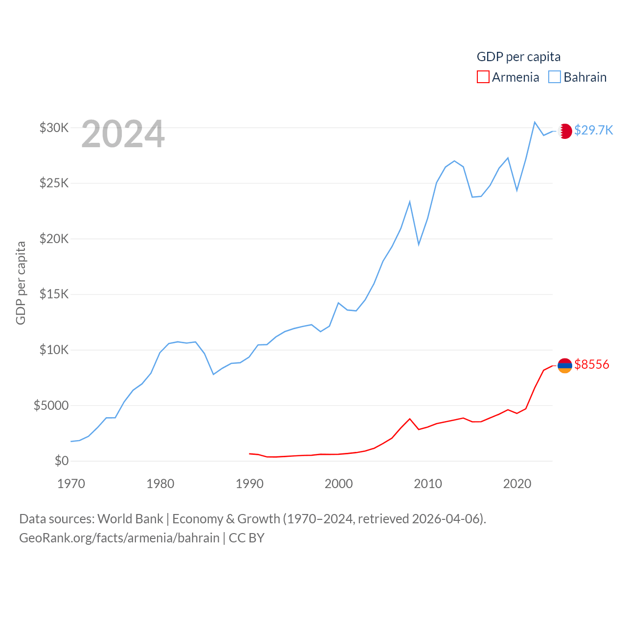 By GDP, Armenia ranks 114/197 ($26B) and Bahrain ranks 96/197 ($47.1B). By GDP per capita, Armenia ranks 90/197 ($8,556), while Bahrain ranks 42/197 ($29,654).