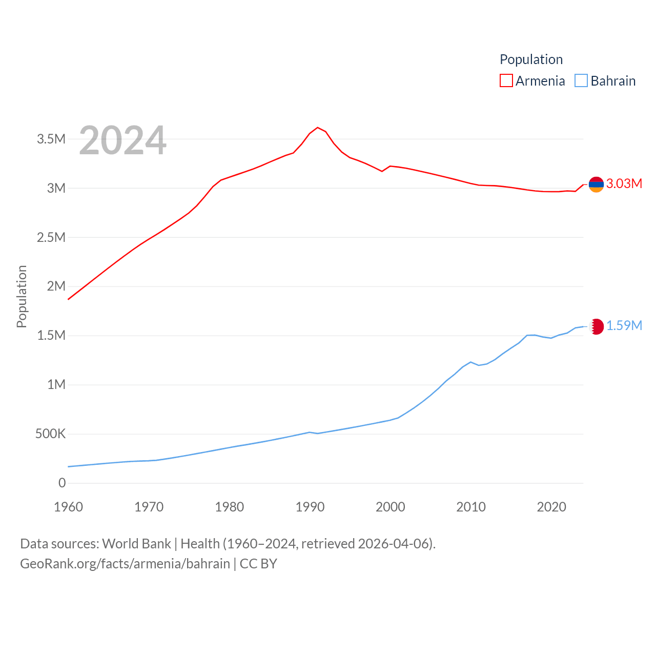 Armenia has a population of 3.03M (ranked 135/197), compared with 1.59M in Bahrain (ranked 151/197). Armenia's land area is 10,888 sq mi versus 309 sq mi for Bahrain (ranked 138th vs. 174th).