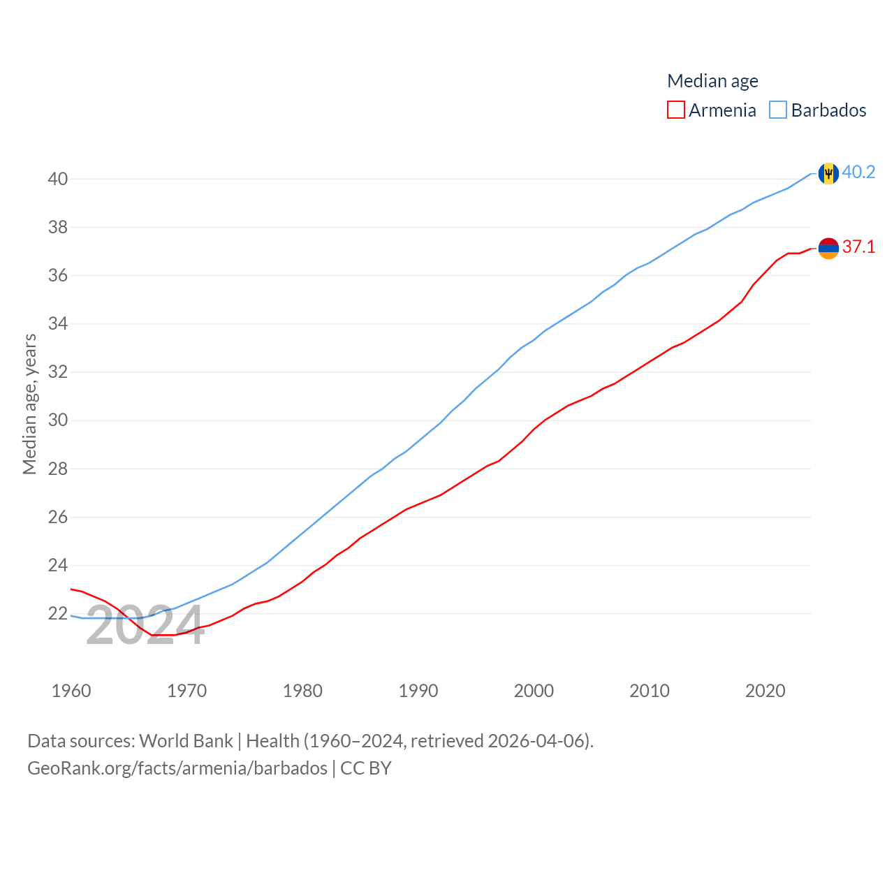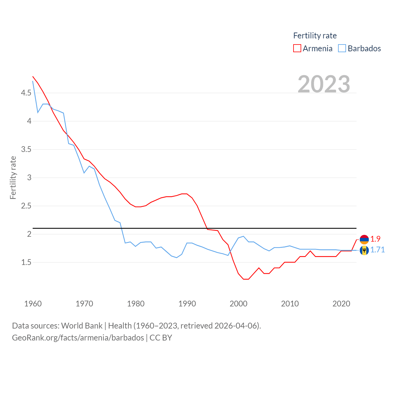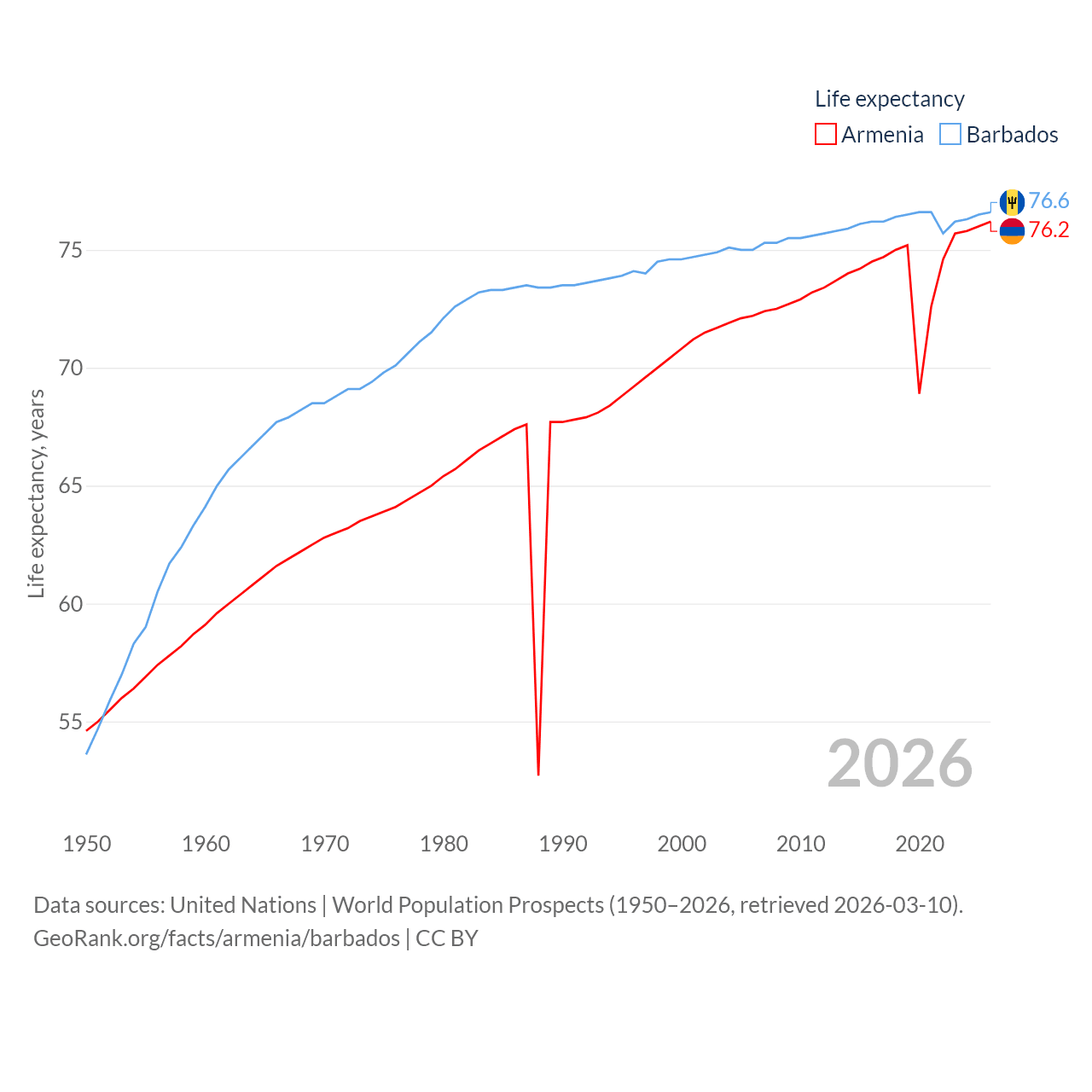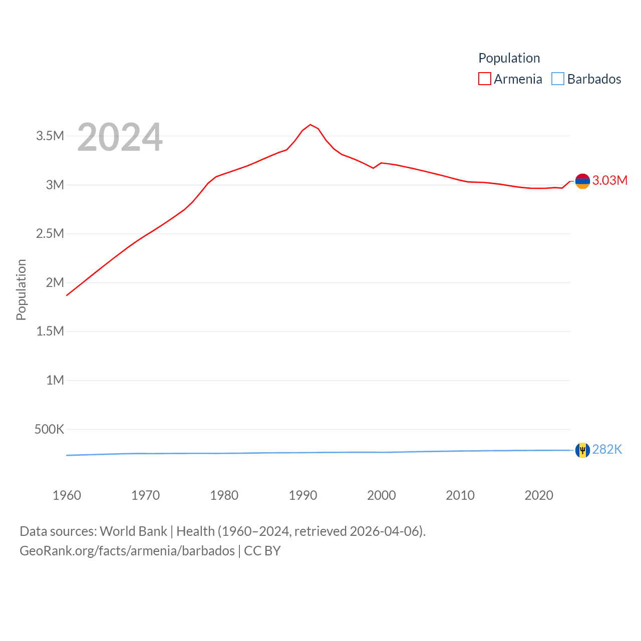 Armenia has a population of 3.03M (ranked 135/197), compared with 282K in Barbados (ranked 175/197). Armenia's land area is 10,888 sq mi versus 166 sq mi for Barbados (ranked 138th vs. 184th).
