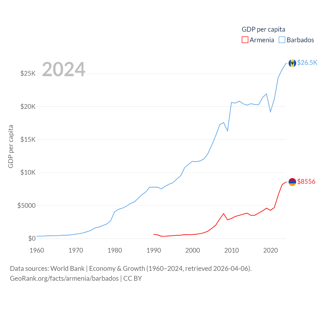 By GDP, Armenia ranks 114/197 ($26B) and Barbados ranks 157/197 ($7.5B). By GDP per capita, Armenia ranks 90/197 ($8,556), while Barbados ranks 46/197 ($26,545).