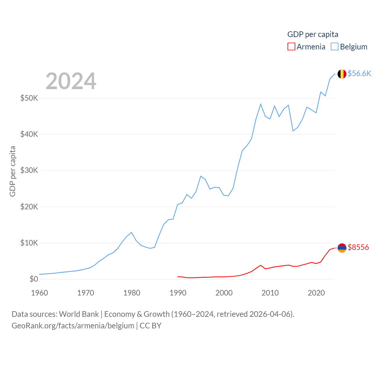 By GDP, Armenia ranks 114/197 ($26B) and Belgium ranks 23/197 ($671B). By GDP per capita, Armenia ranks 90/197 ($8,556), while Belgium ranks 18/197 ($56,615).