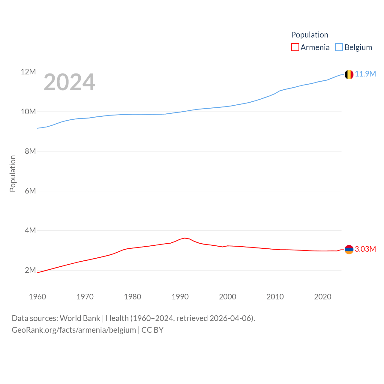 Armenia has a population of 3.03M (ranked 135/197), compared with 11.9M in Belgium (ranked 82/197). Armenia's land area is 10,888 sq mi versus 11,774 sq mi for Belgium (ranked 138th vs. 136th).
