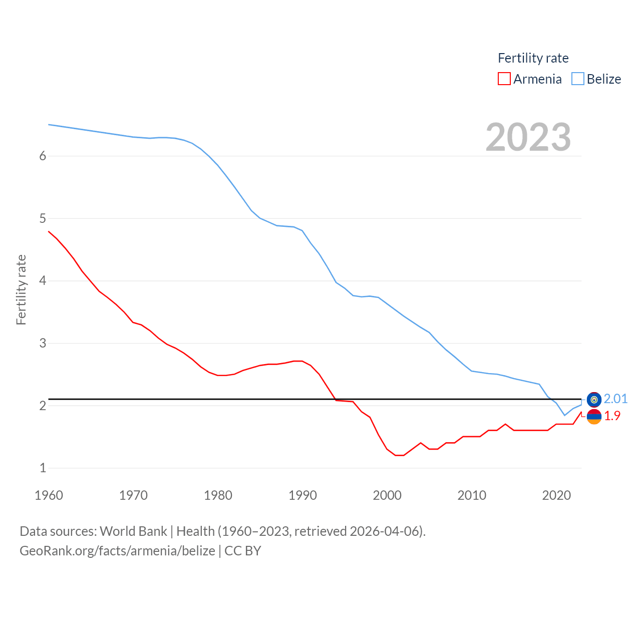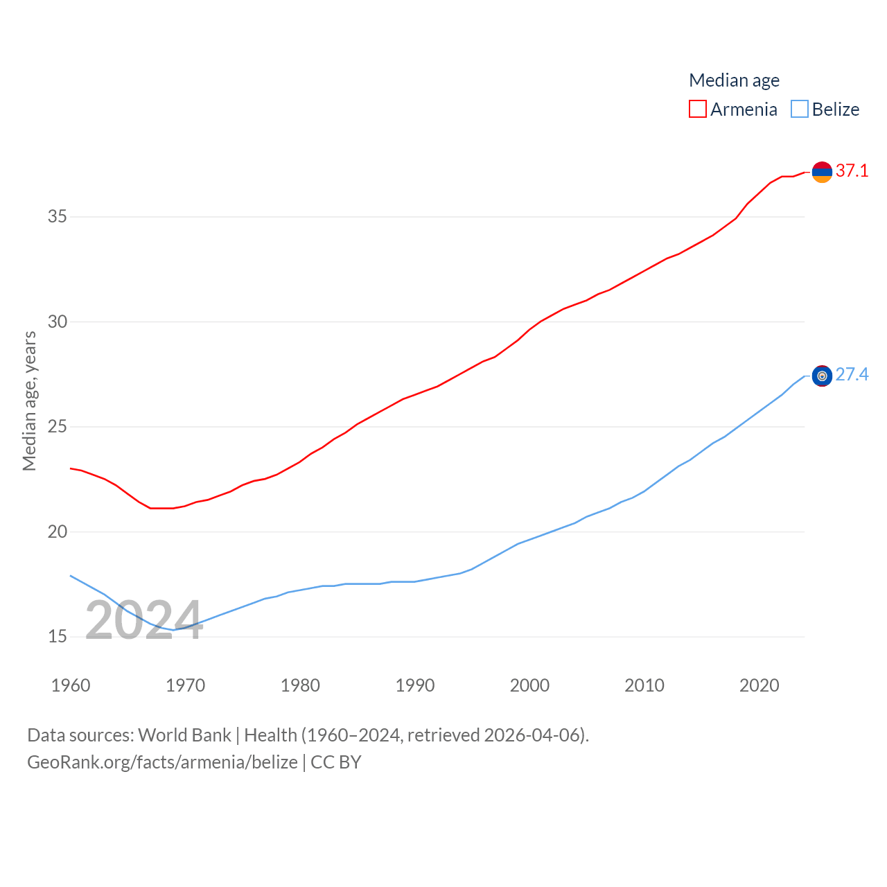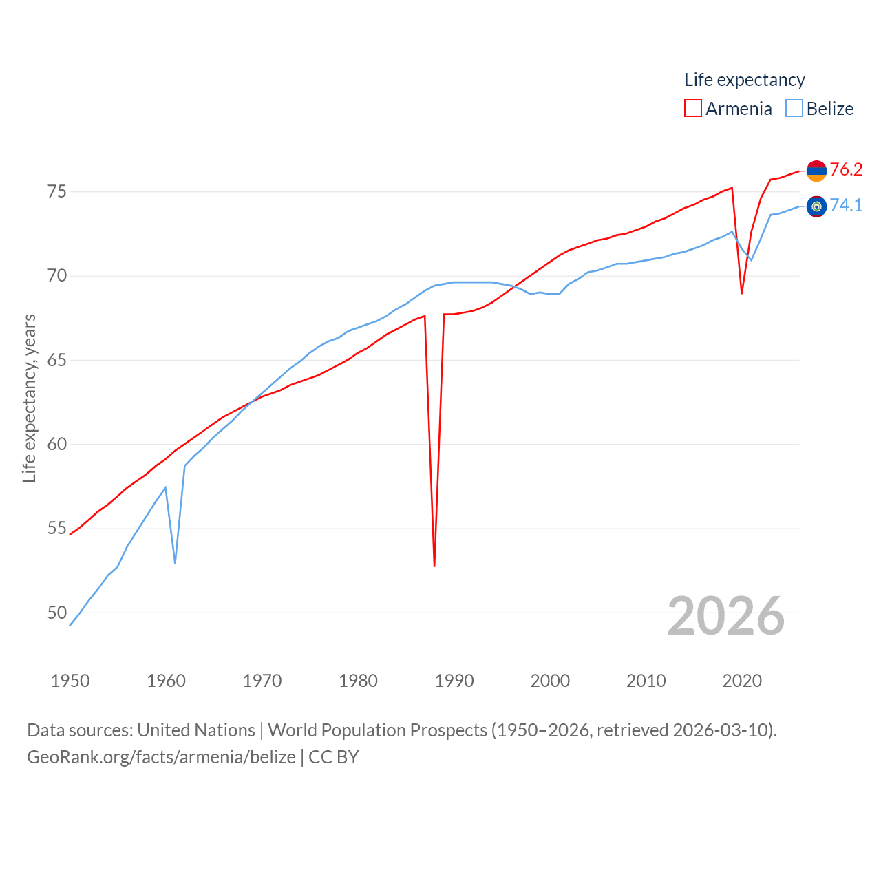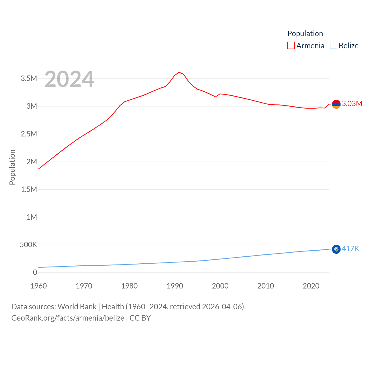 Armenia has a population of 3.03M (ranked 135/197), compared with 417K in Belize (ranked 171/197). Armenia's land area is 10,888 sq mi versus 8,807 sq mi for Belize (ranked 138th vs. 148th).