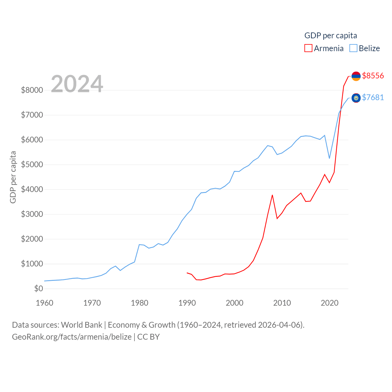 By GDP, Armenia ranks 114/197 ($26B) and Belize ranks 168/197 ($3.2B). By GDP per capita, Armenia ranks 90/197 ($8,556), while Belize ranks 98/197 ($7,681).